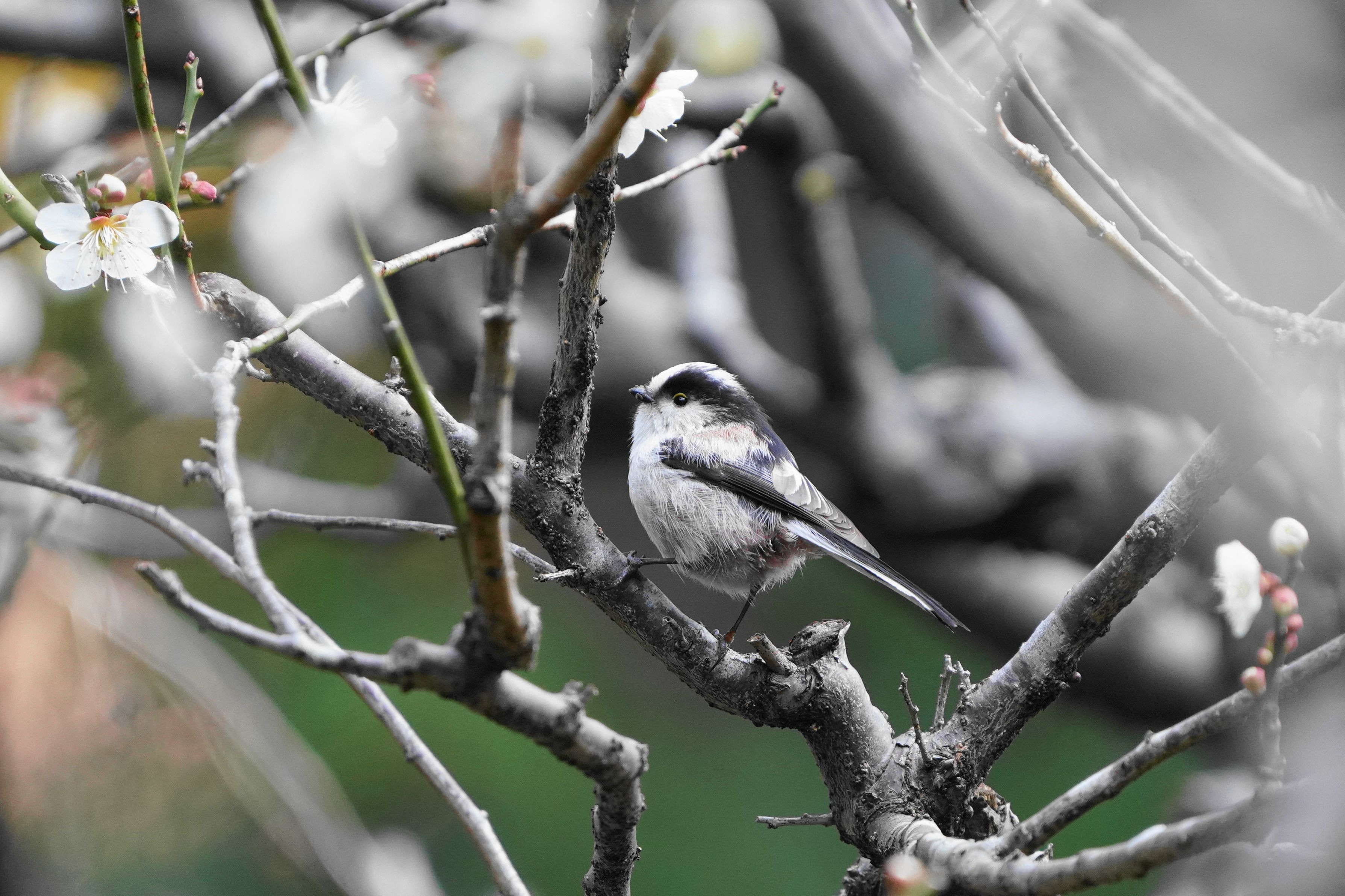 エナガも花には興味が無い様で塩対応です。 そもそもジッとしてくれない子なのですが、花に見向きもせずに通り過ぎていく もう少し遊ばせてくれても・・・。