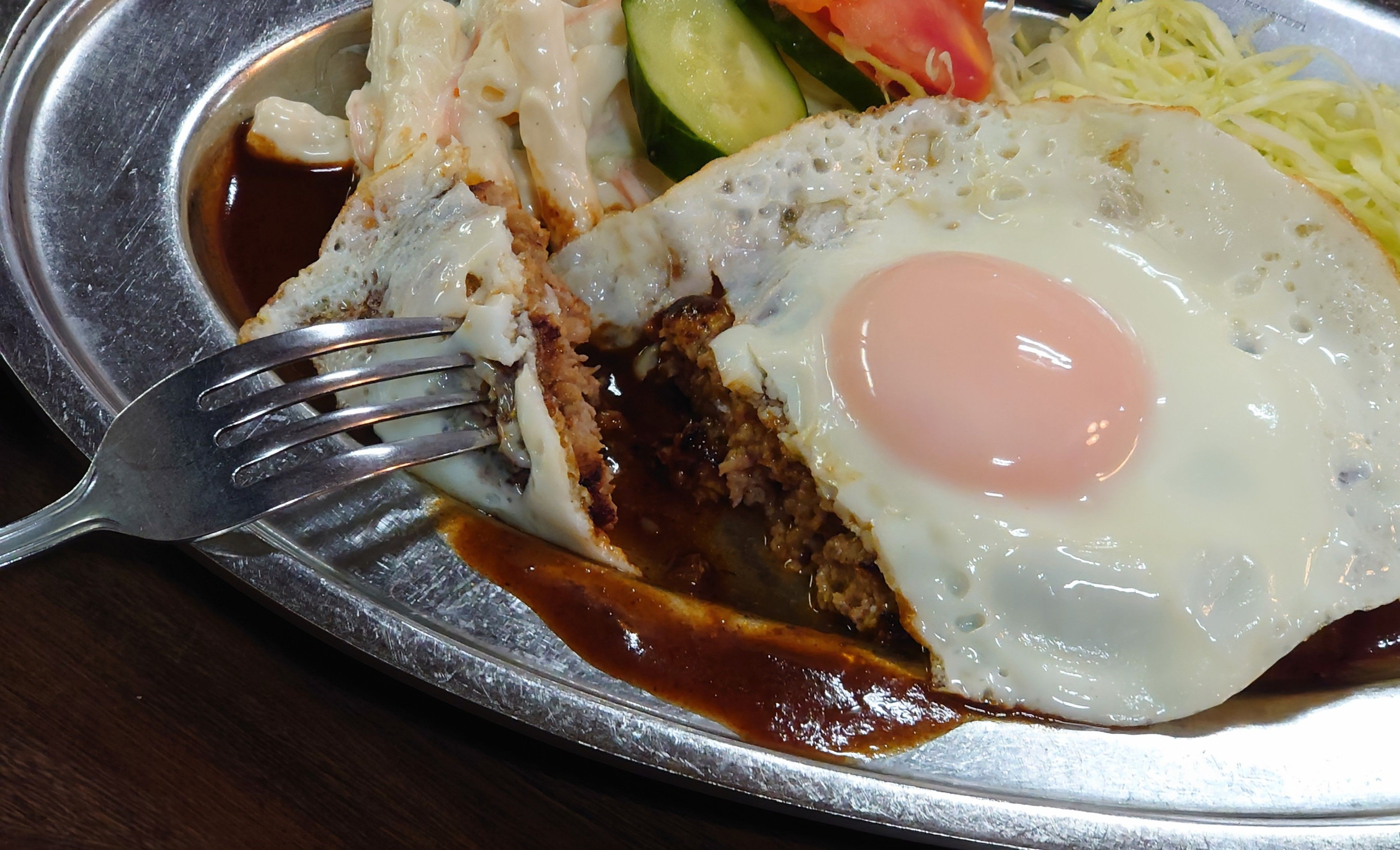 昭和の食堂そのもののハンバーグに目玉焼きをのせ、キャベツやきゅうり、トマト、マカロニサラダの付け合わせが美味しい一品です🙂🍀♥