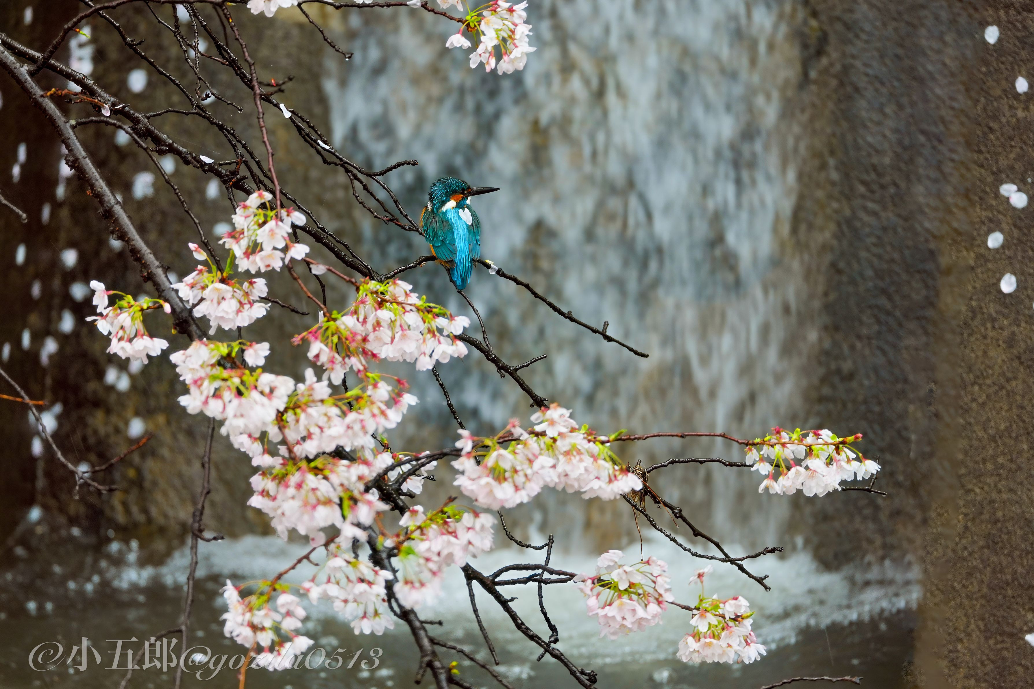 日本人で良かったぁ〜! 桜は咲いて美しく。。。 散りはじめてまた美しく。。。さくらの花びらがカワセミさんのハートを貫きました。 背景の瀧と。。。桜筏がとても風情でとても想い出深い瞬間となりました。。。