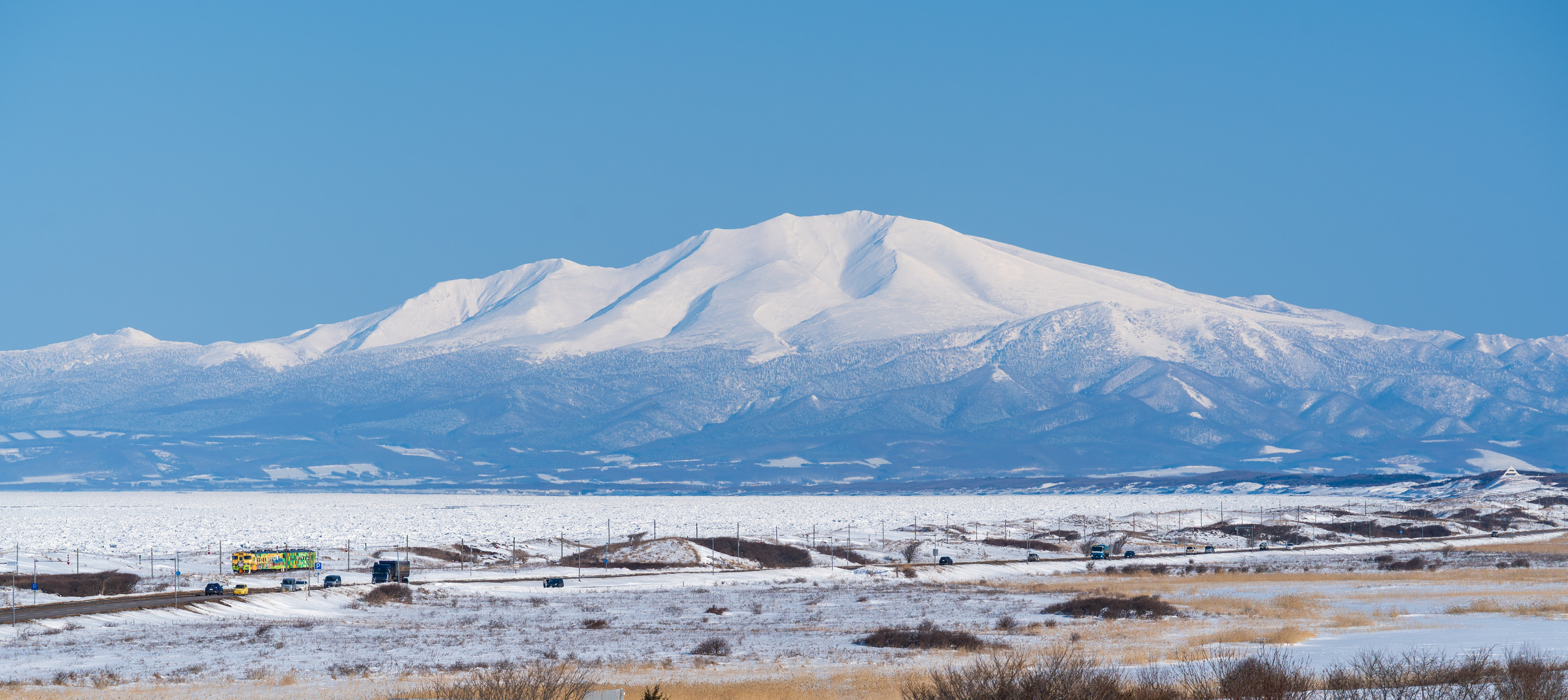 こんなに海別岳が綺麗に見えた事は記憶に有りません。 知床の海は流氷で埋め尽くされています。 走って来てくれたのは流氷号でした。 海別岳の裾野の広がりを見せたくて横長にトリミングしてます。