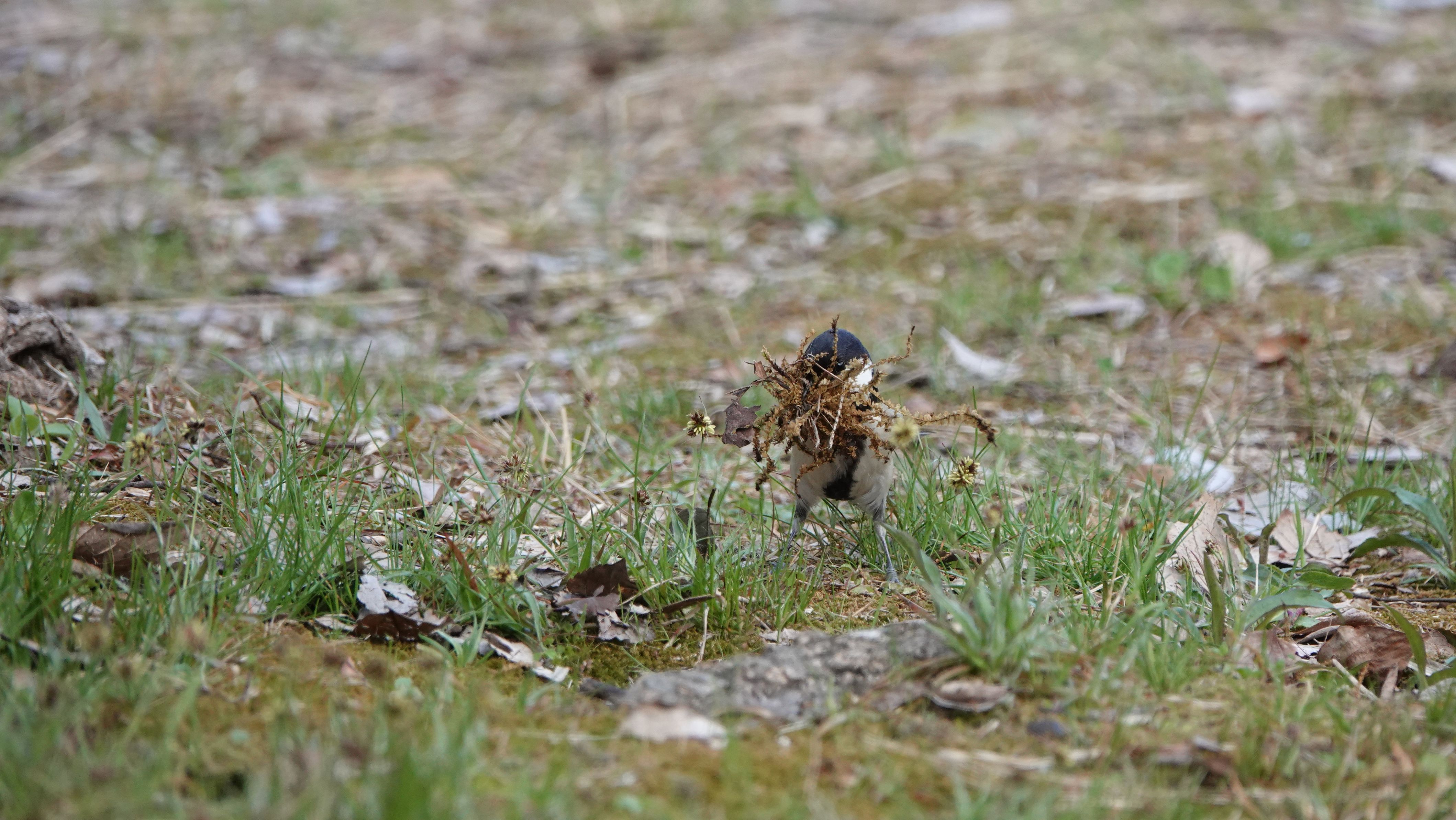 巣作りをしているのでしょう。口一杯に巣材(苔)を咥えています。