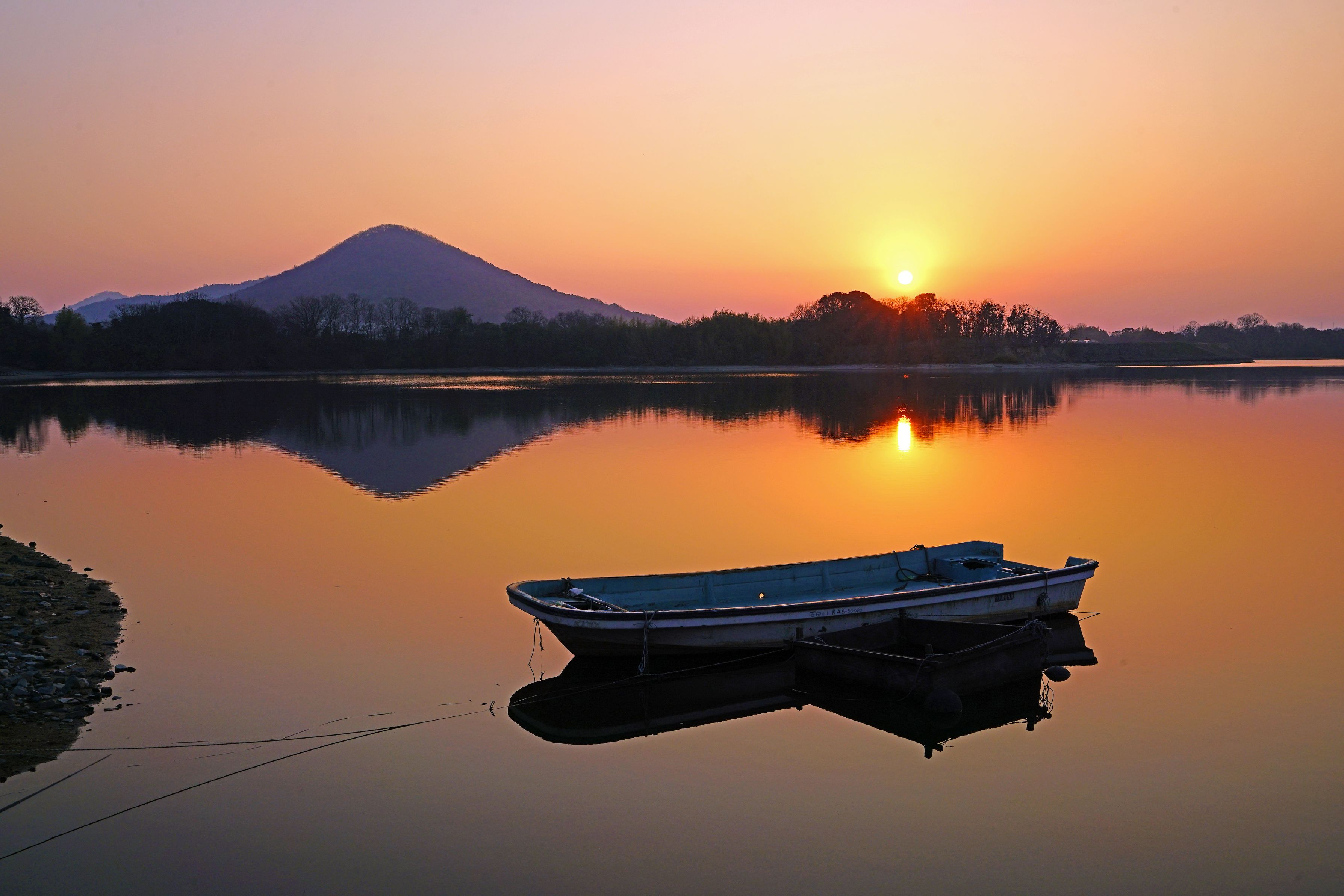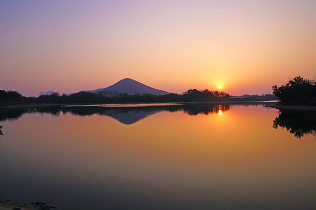 黄砂の中、陶富士を映すため池の朝。