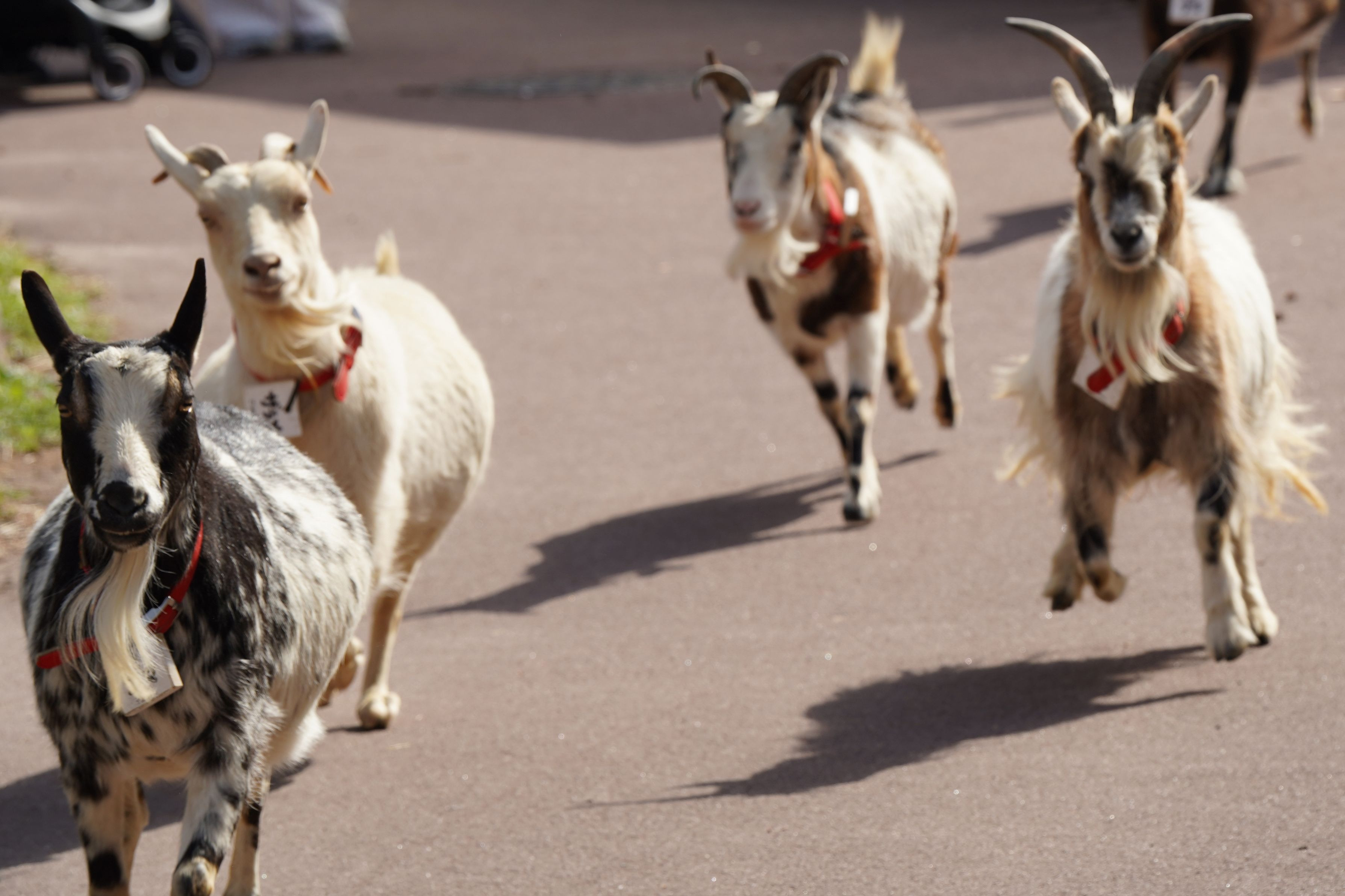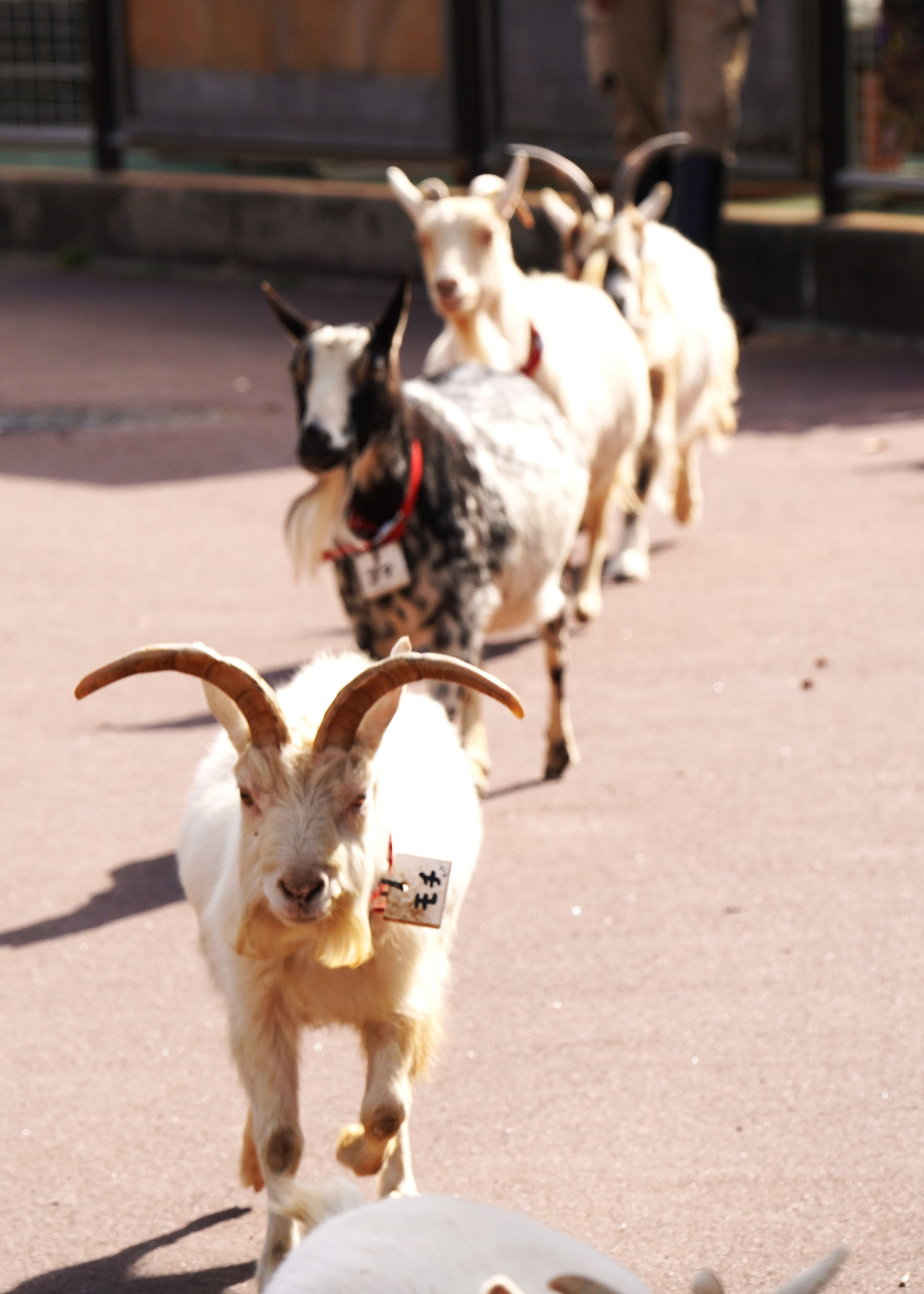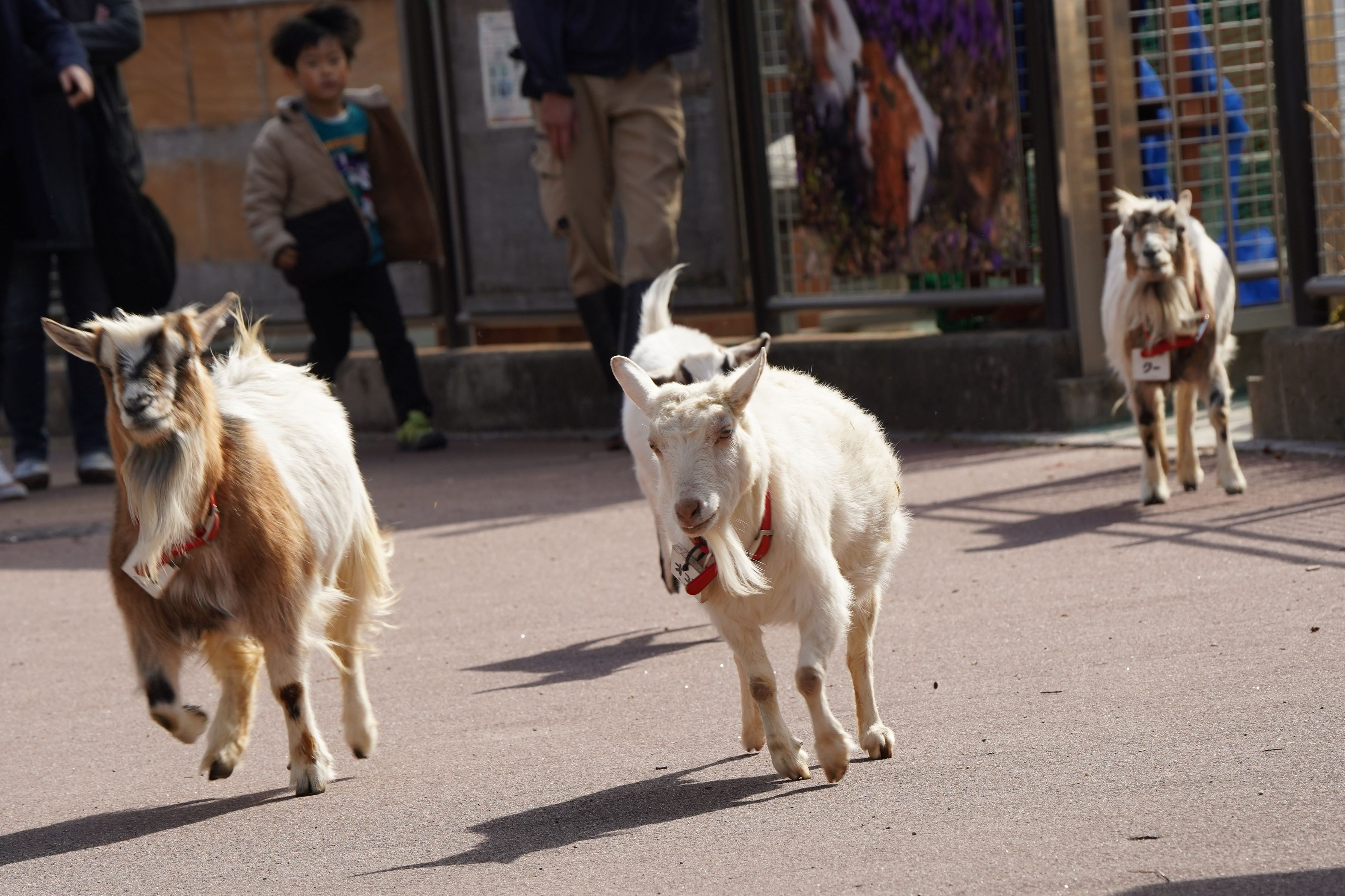 開園して直ぐ飼育小屋からもぐもぐ広場まで駆け足で出勤していくヤギさんたちの様子です。この後、子供たちからエサをもらいます。