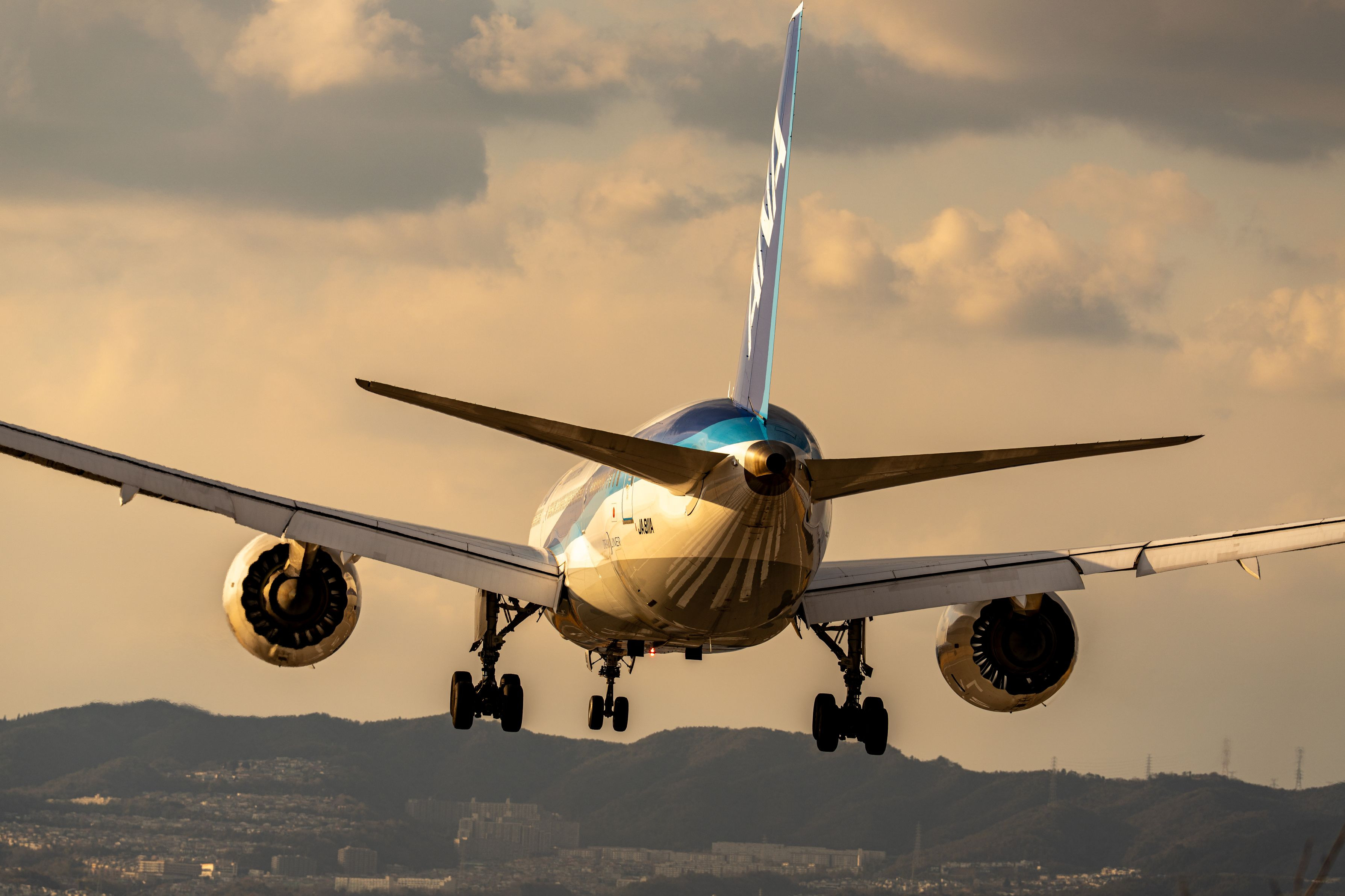 大阪国際空港に着陸態勢に入った機体に夕日が当たりとても綺麗でした。