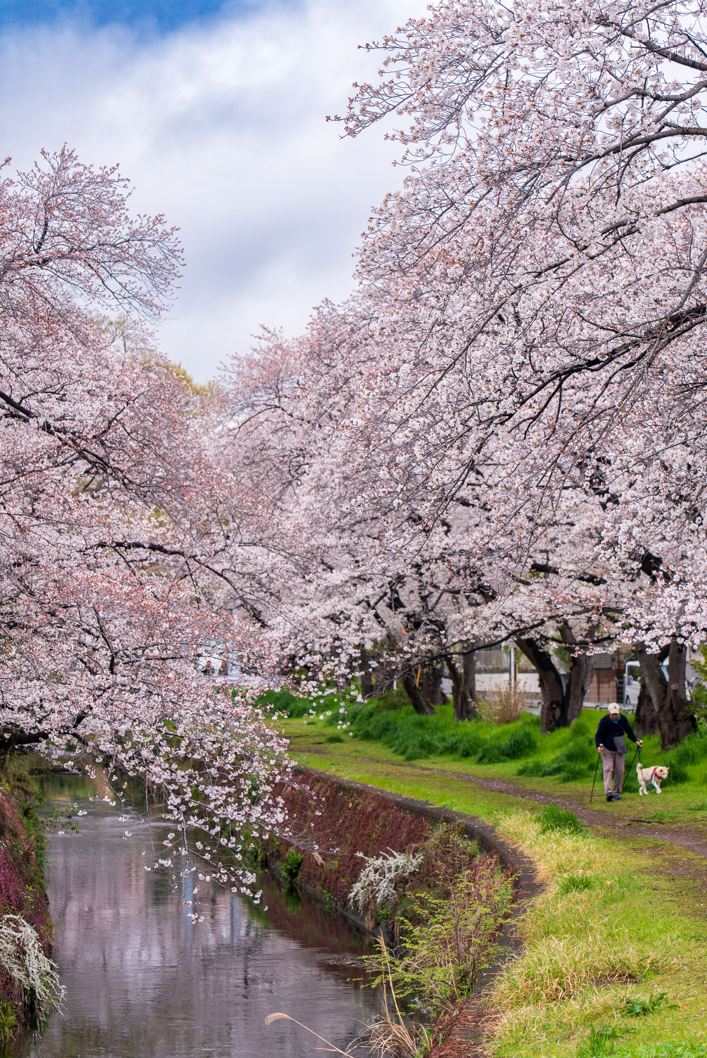 桜が満開の中、愛犬の散歩をするおじいさん。いつになく足取りも軽そうだ