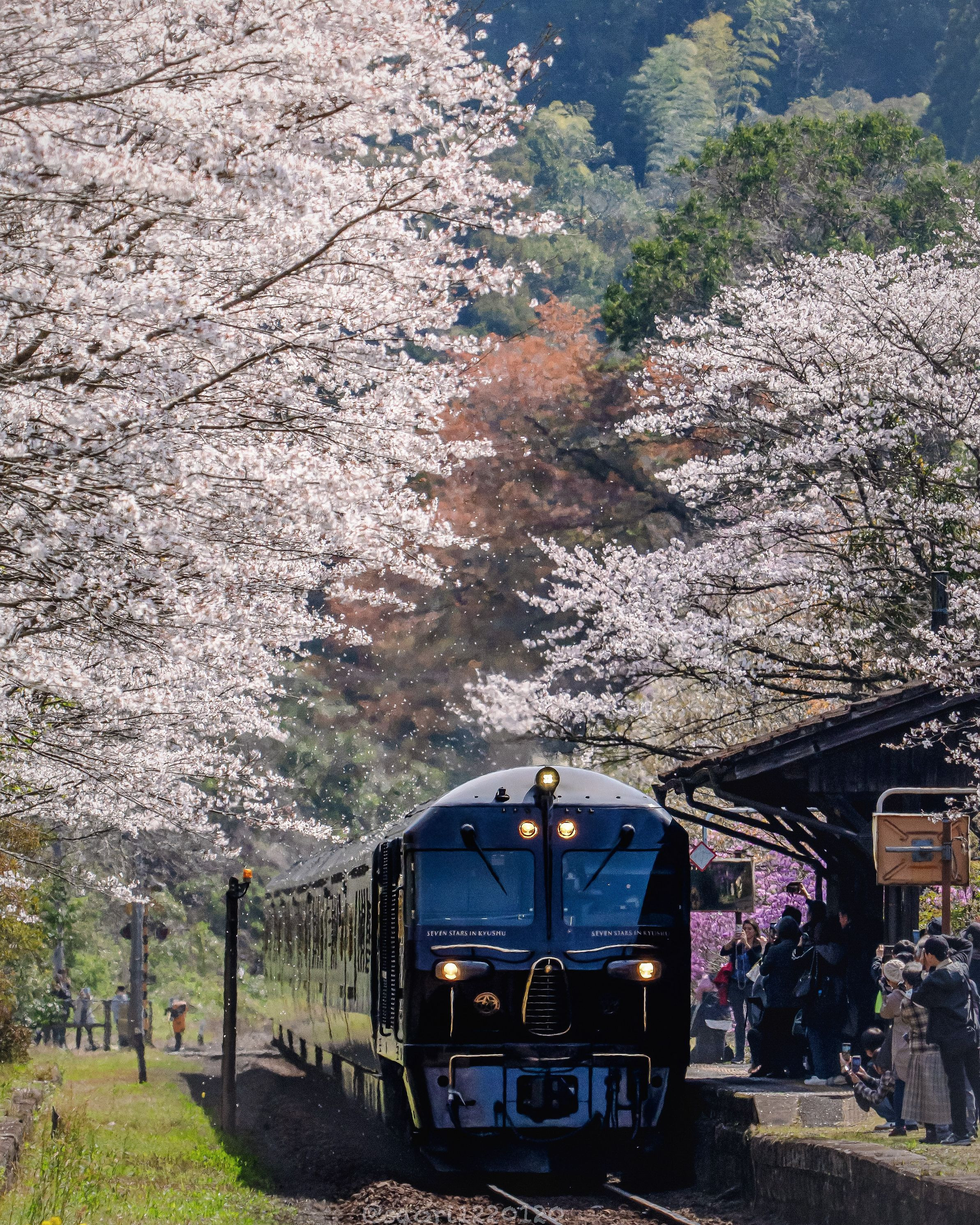 桜並木にななつ星in九州が来ました。桜吹雪が綺麗でした。
