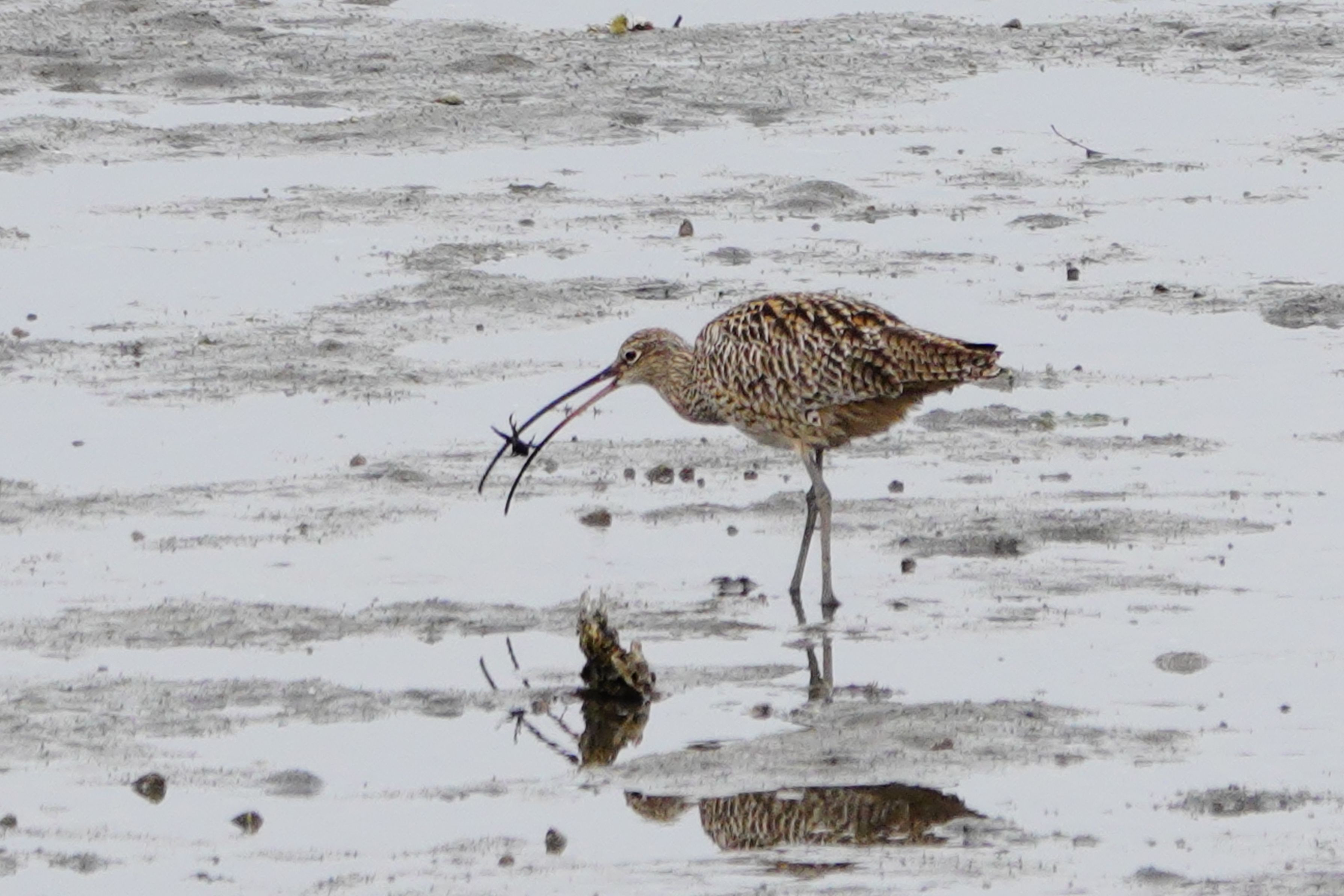 久し振りにやって来たホウロクシギです。片足が何かケガをしたのか足を引き付って歩いている様です。でも食欲はあり嘴を干潟の中に奥く深くまで突っ込みカニを見つけては食べていました。