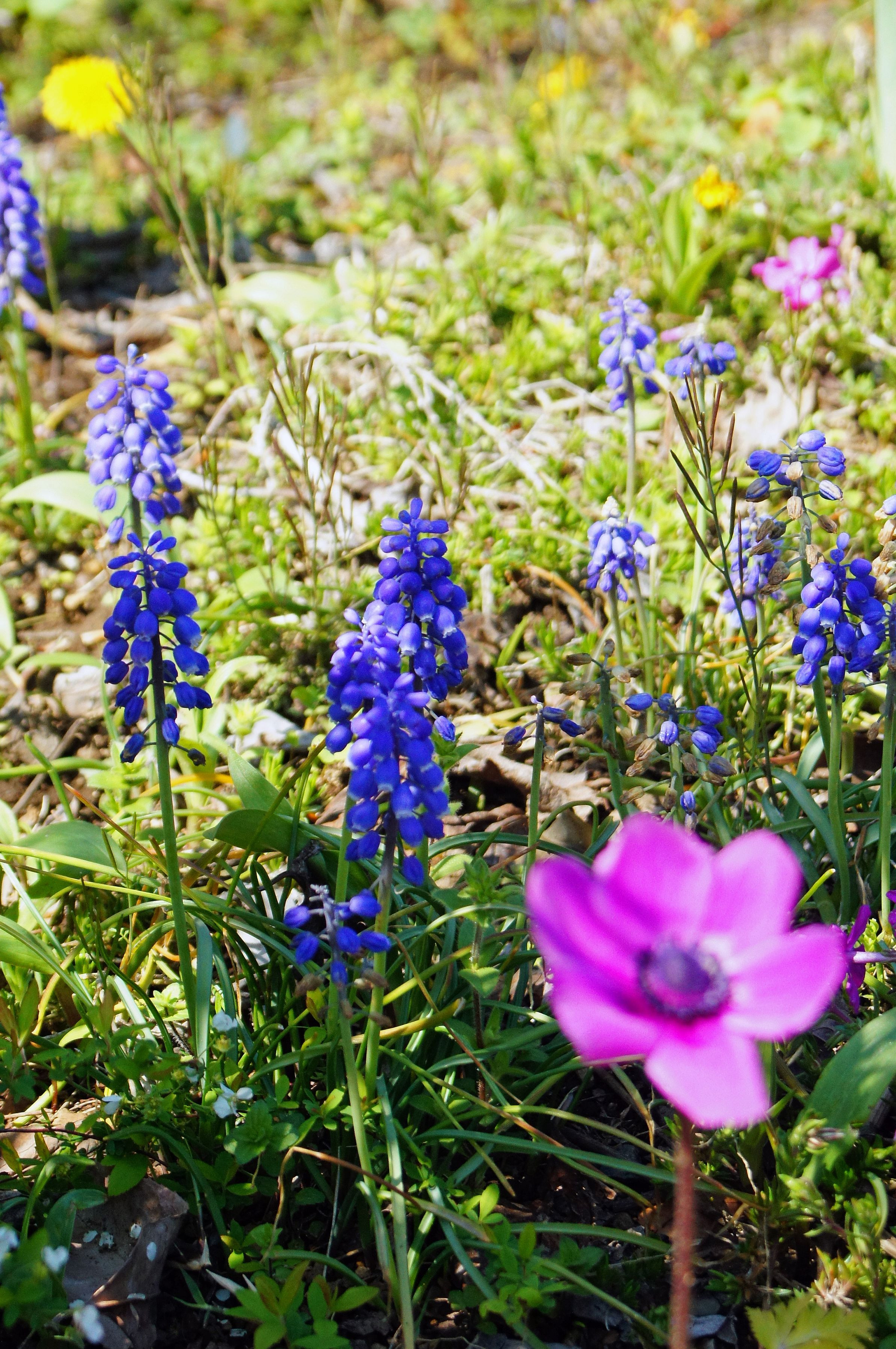 道端で春の陽を受けて花々が咲いていました。