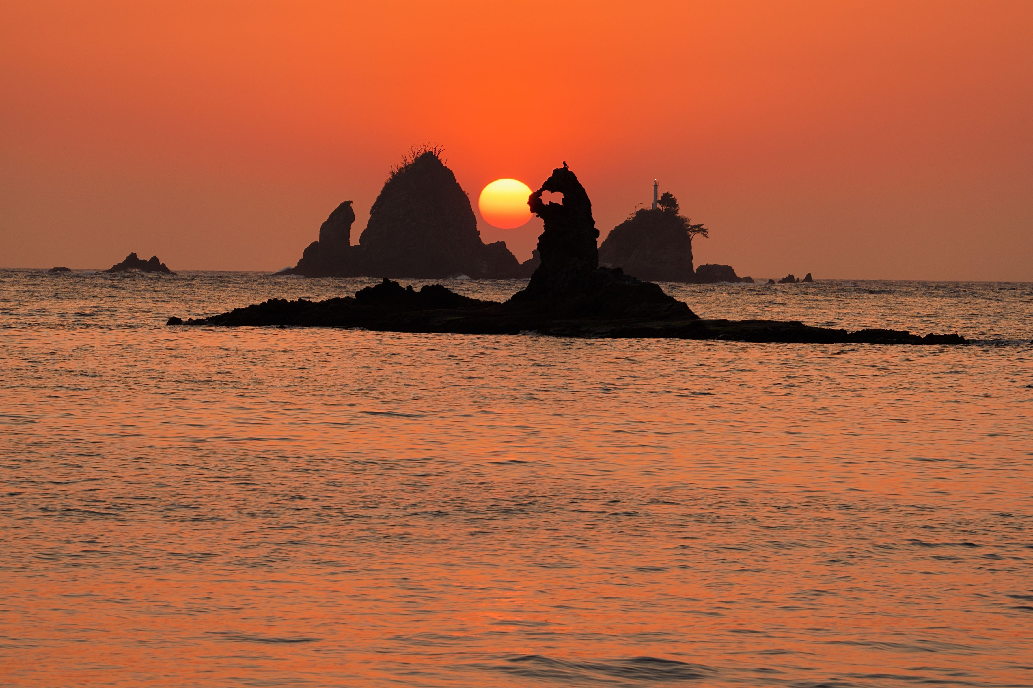 西伊豆の田子海岸で奥の田子島の前にゴジラ岩を入れてそこに夕日が落ちる瞬間は3月23日か9月18日しか見られない。ただ天気がよくて風が強くない日でないと中々見れません。15年通って今年、この一枚です。