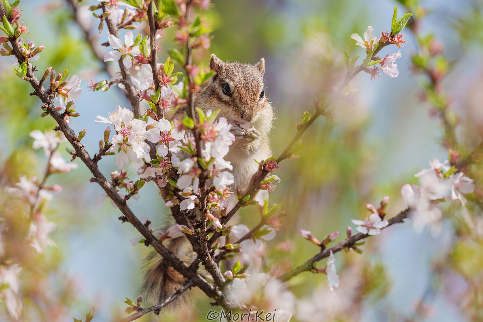 桜っぽい花を食べてるシマリス ウスラウメという花だそうです メルヘンな感じで可愛いです