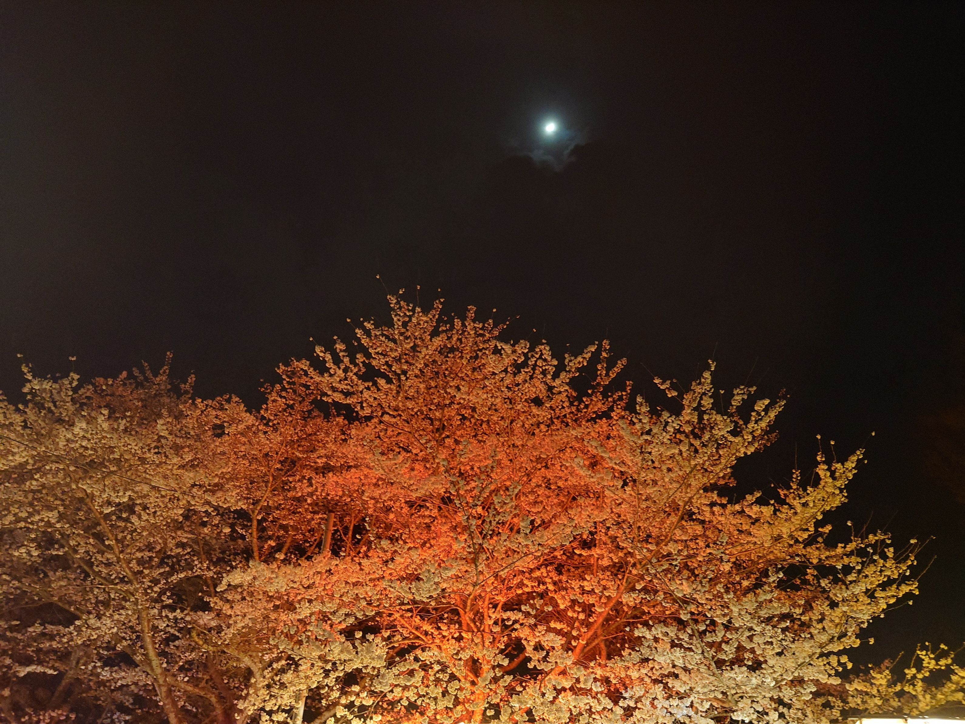 屋台の灯りに照らされた夜桜