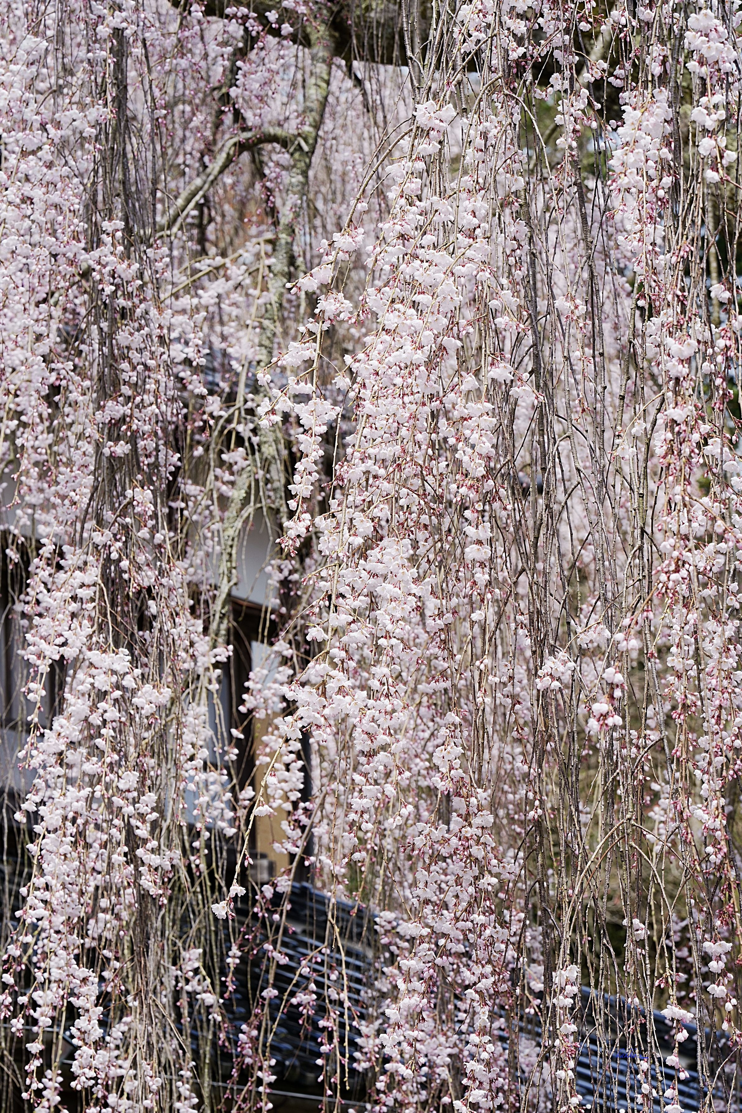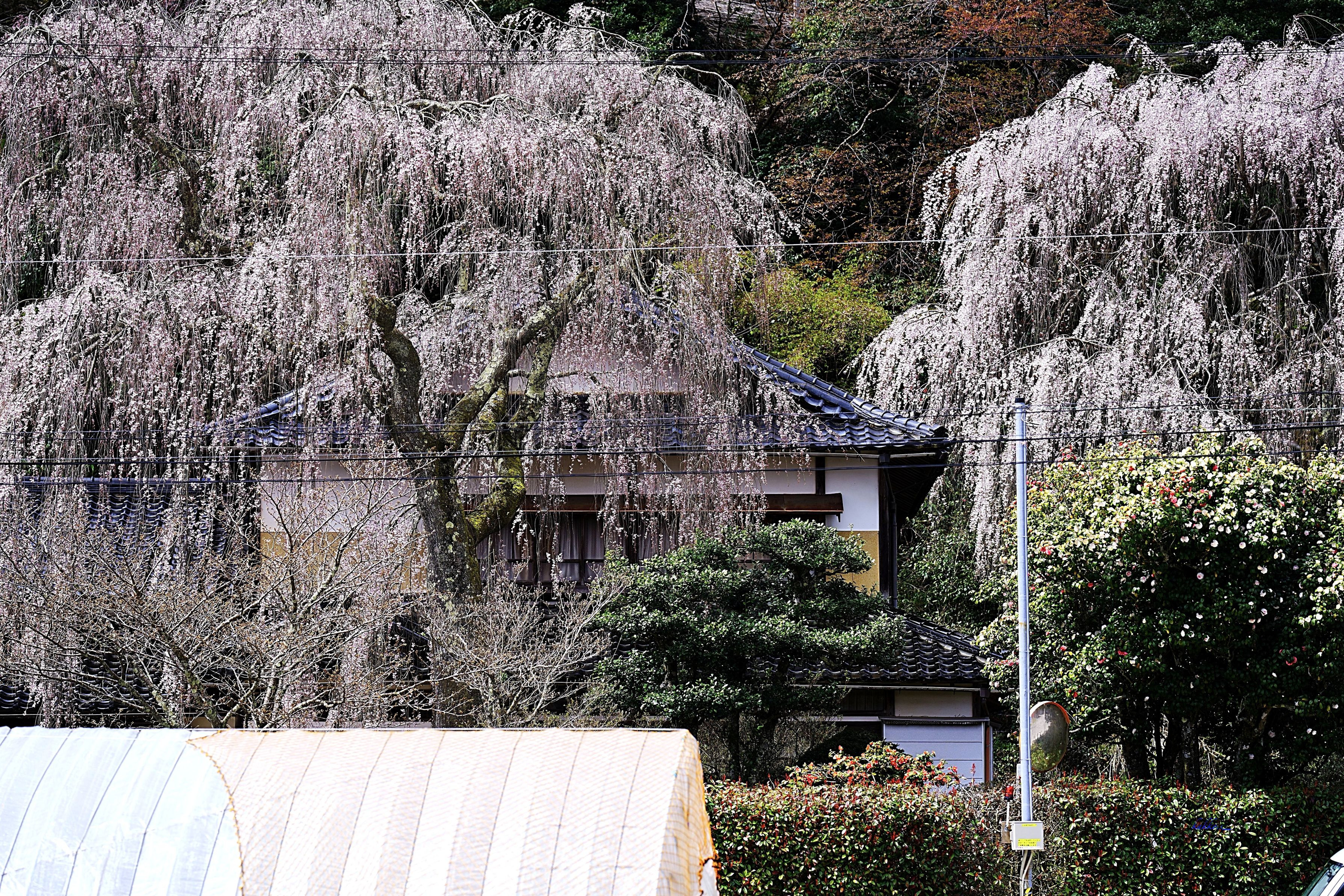 喜多家のしだれ桜です。(番外) 窓の前に咲いているのを撮るとすだれみたいになってしまいました。 2枚目は離れたところから撮りました。 樹齢120年を経過しており、高さ13メートル、幹回り1.6メートル、枝張り11メートルの美しい姿です。 #フラワー2025#