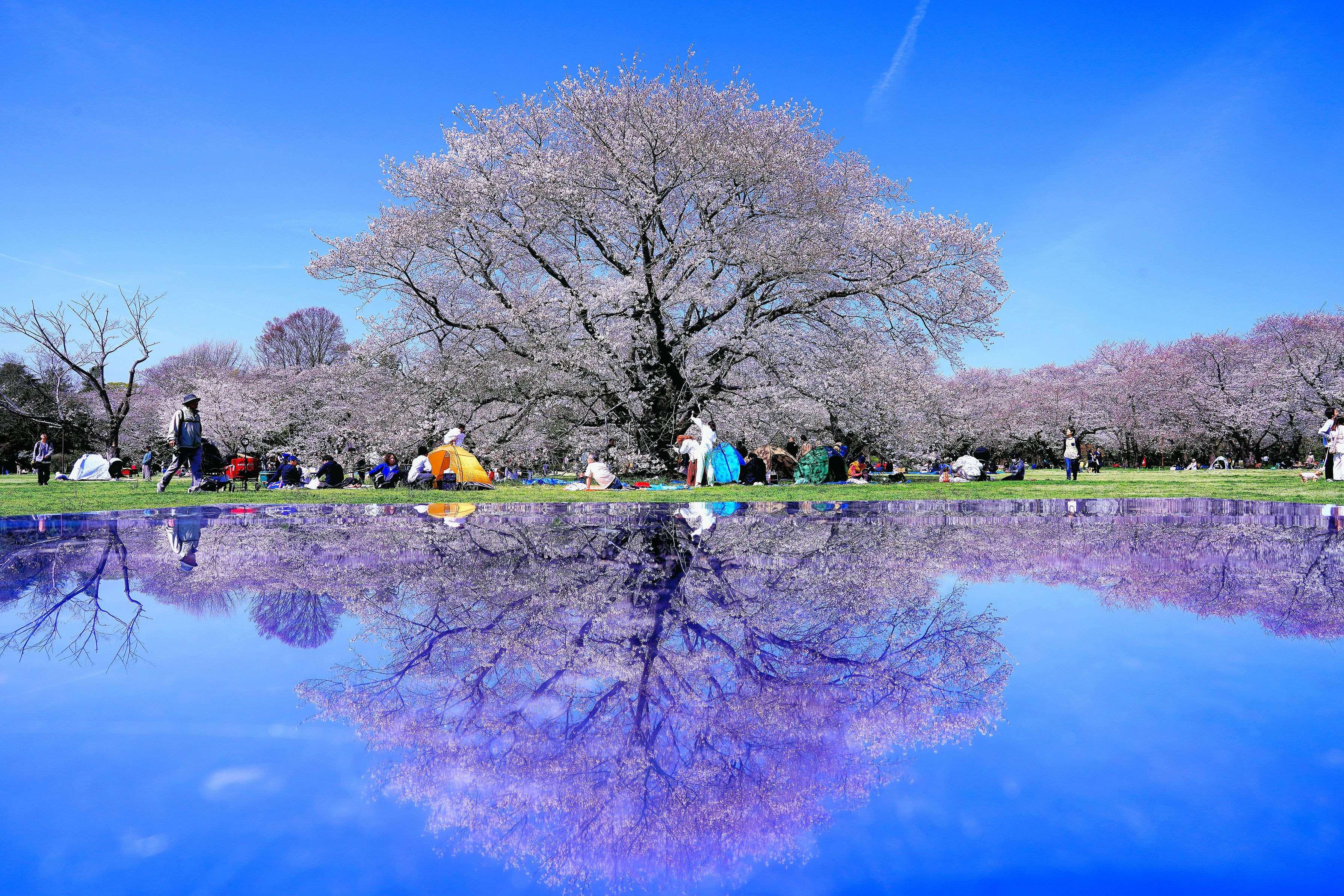 #フラワー2025# 朝一番(am9:30)で入園してもこの様子。 簡易テントの設営、シートを広げる来園客が特等席を確保に大忙しです。 リフレクション用に用意された立派な桜の前は勿論人気NO.1 あと1時間もすれば……