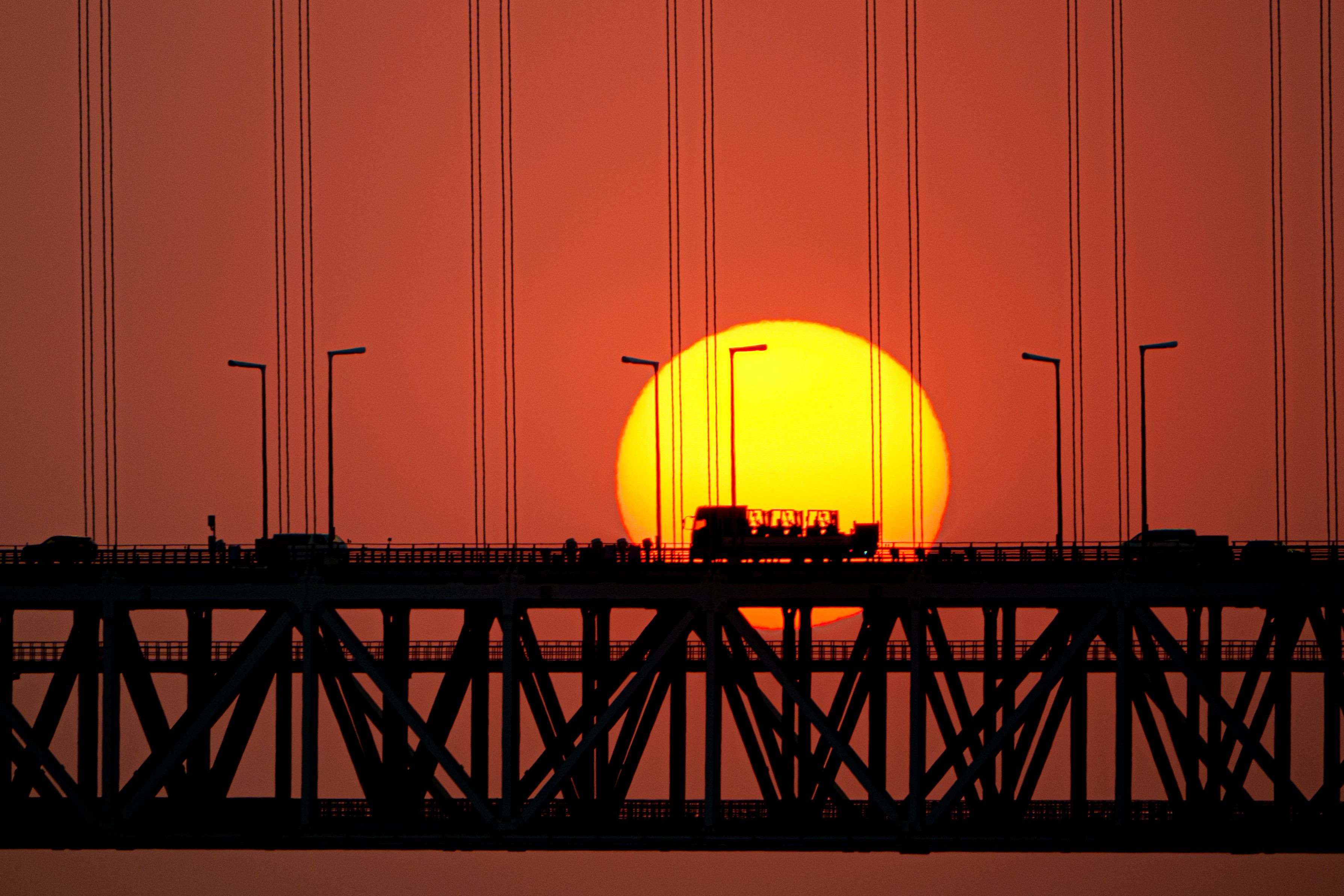 日没前に明石海峡大橋を渡る車両を太陽をバックに撮影しました。
