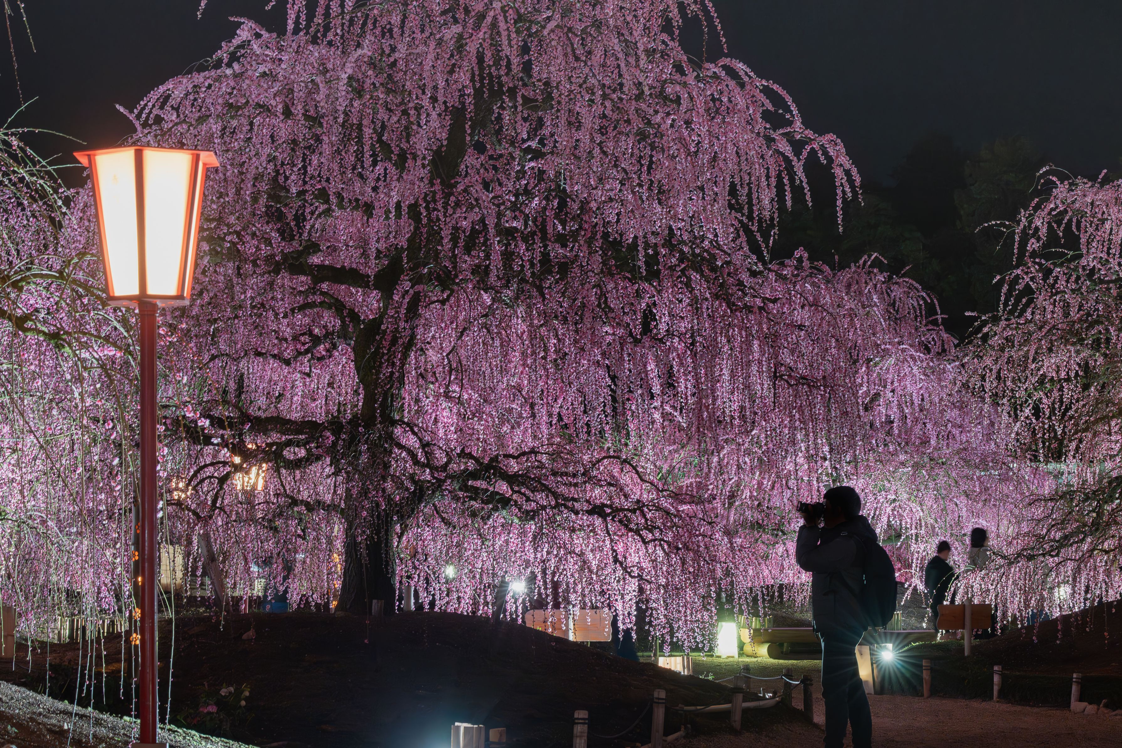 三重県鈴鹿市にある「鈴鹿の森庭園」の枝垂れ梅 撮影していた青年をシルエットにして撮影(撮影許可いただいております) とても綺麗なライトアップでした。