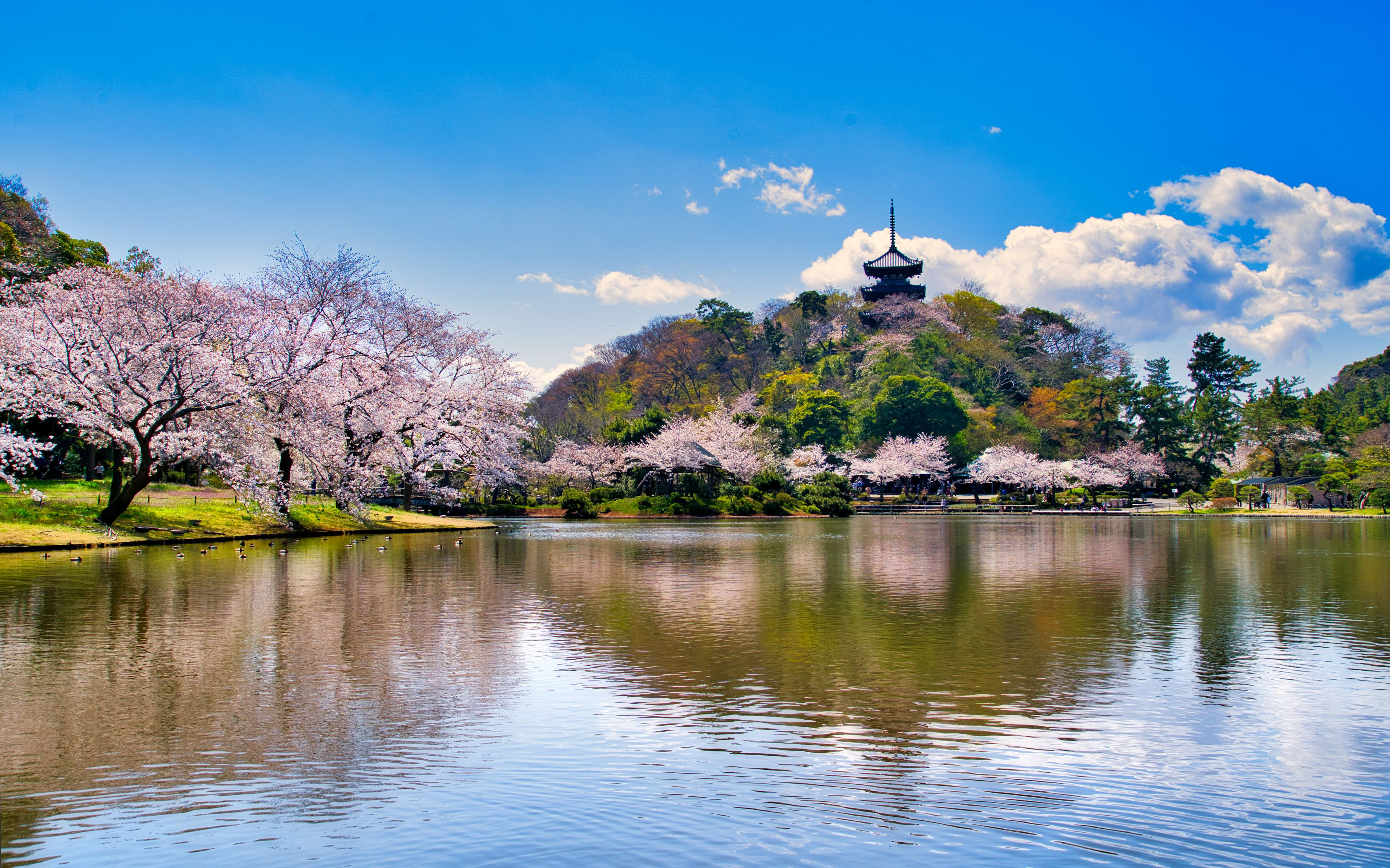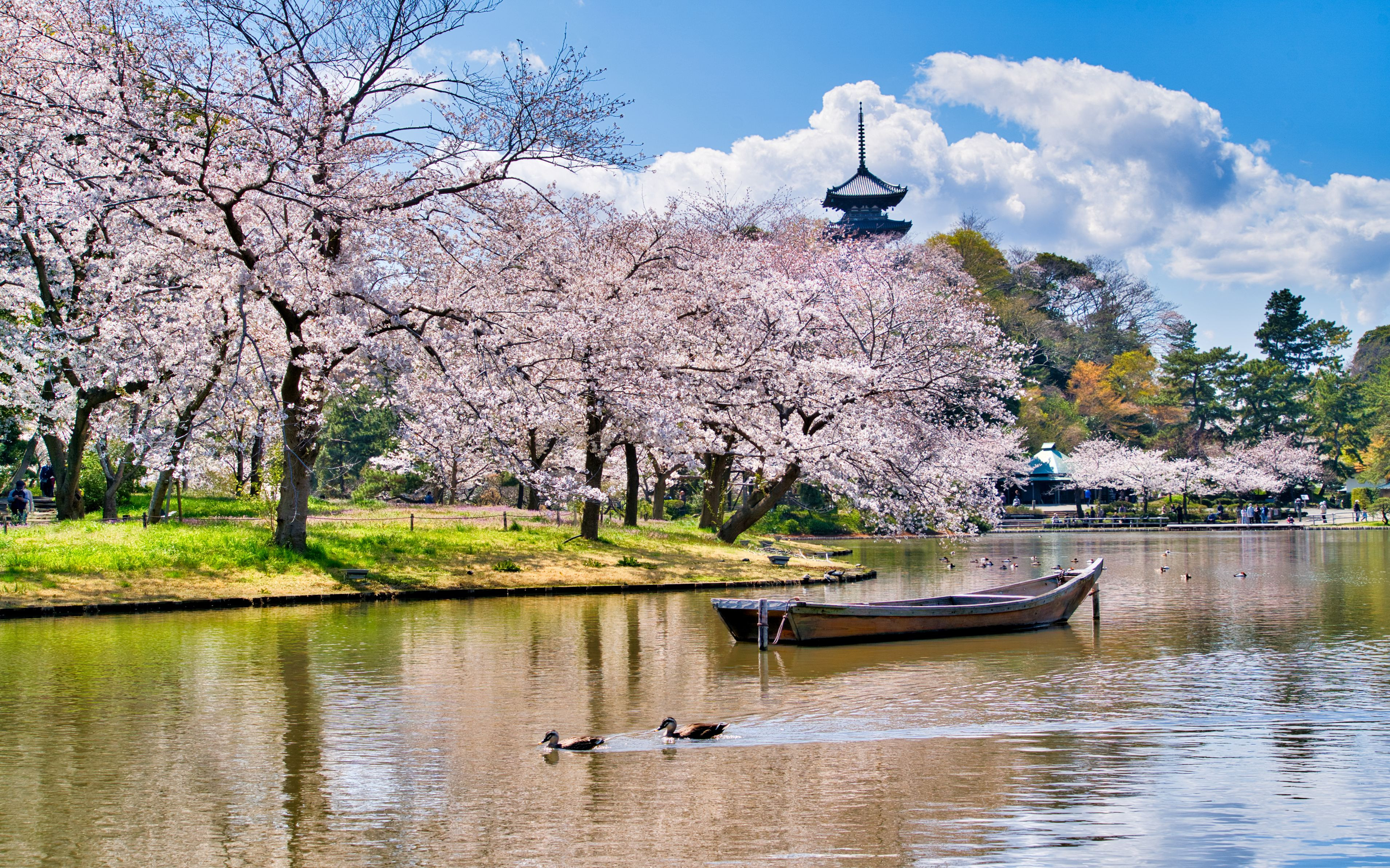三渓園と言えばおなじみ定番構図:大池「舟・桜・三重塔」 #三溪園# 天気は晴天・雲も良い感じ!鴨さんが泳いできたタイミングで情景表現しました。 #神奈川県# #フラワー2025# #三渓園#