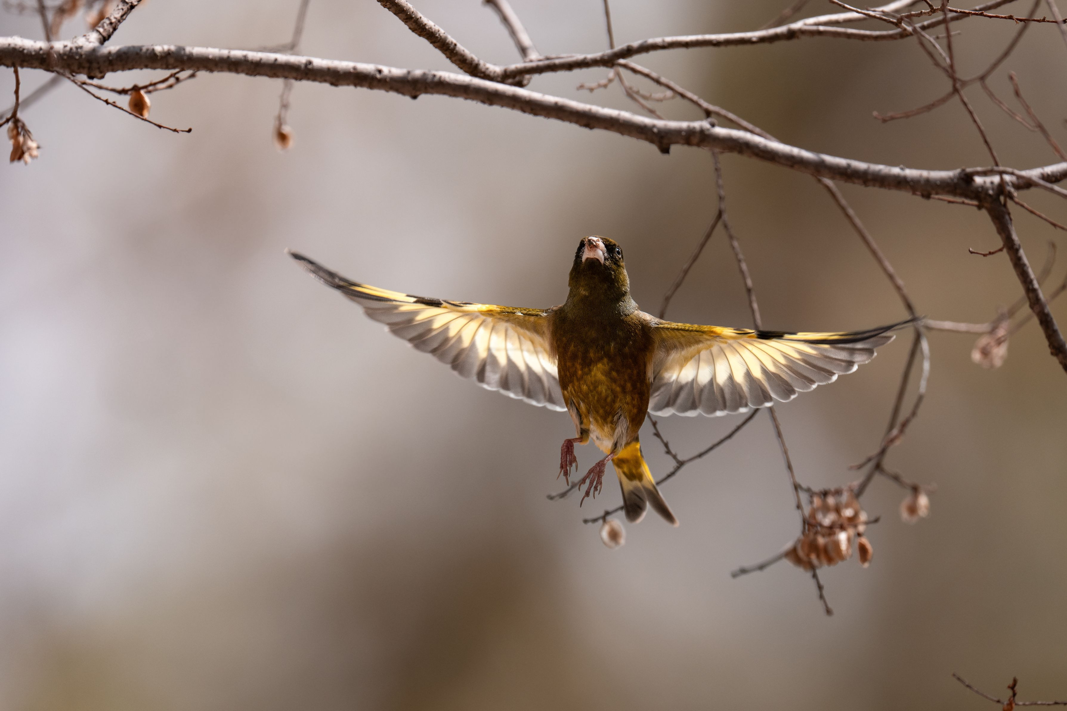 翼を広げたカワラヒワさんは、他のどんな鳥にも劣らない美しさがあると思っています
