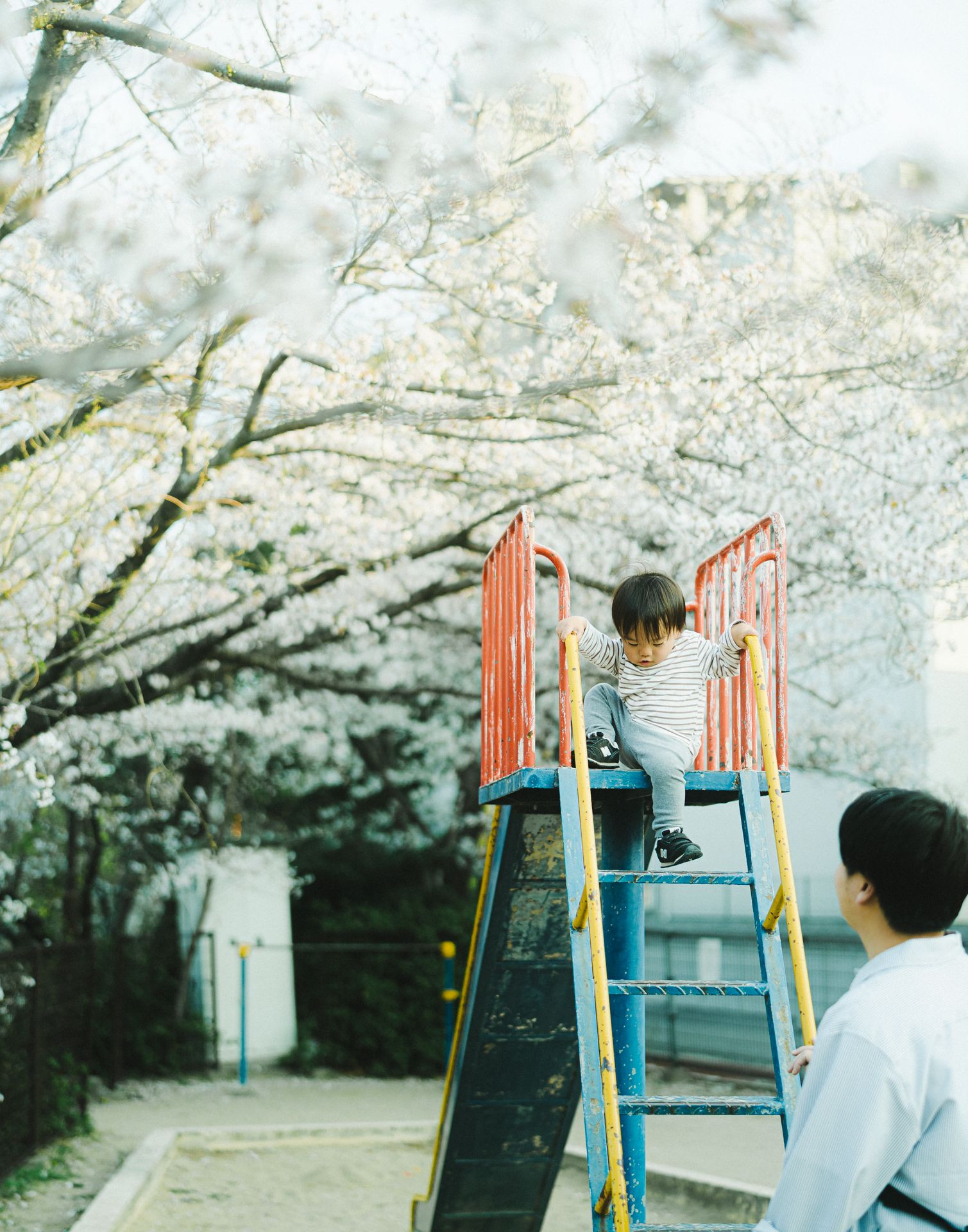 父ちゃんも登れ、とアピールするものの 来てくれないからじゃあ降ります… いやいや、すべり台からすべって来てください。笑