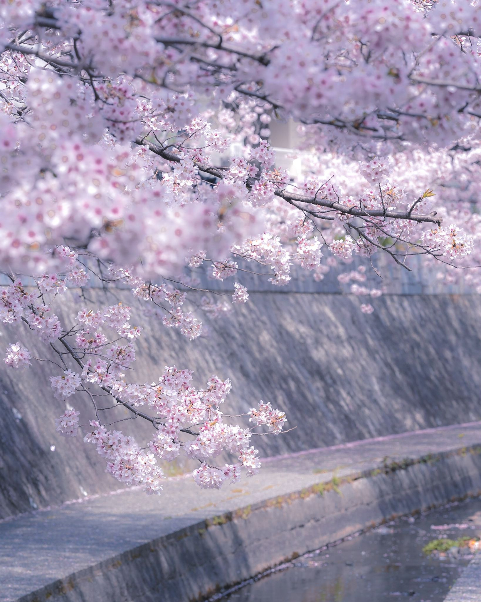 桜並木が続く通りを水路から眺め、撮影しました。