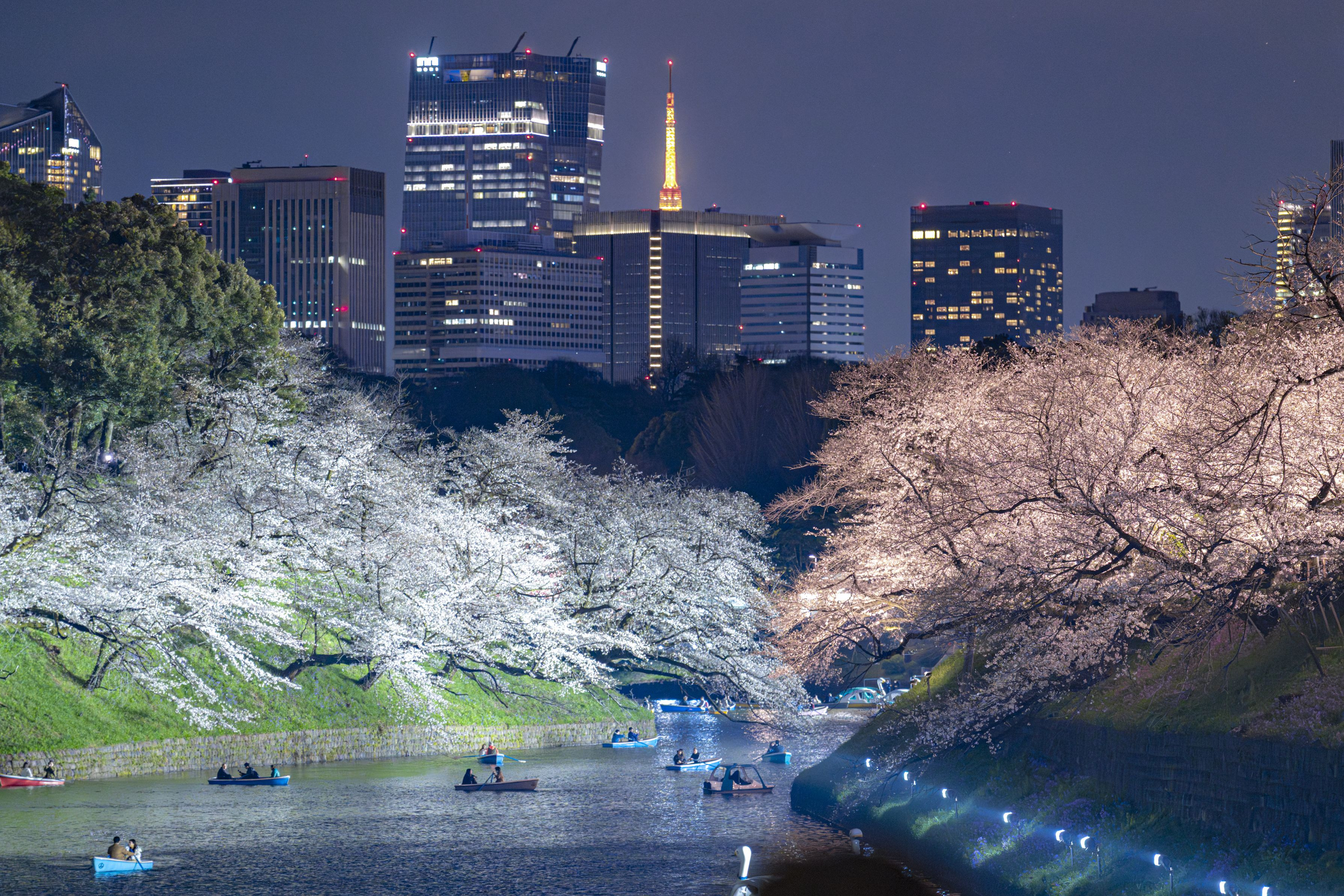 千鳥ヶ淵からのお約束の撮影スポットですが、新しいビルが増えて、こんなにも見えなくなってしまった東京タワー。 ただ、桜は照明の色が分かれて白とピンクに見えますが、幻想的で良きです。