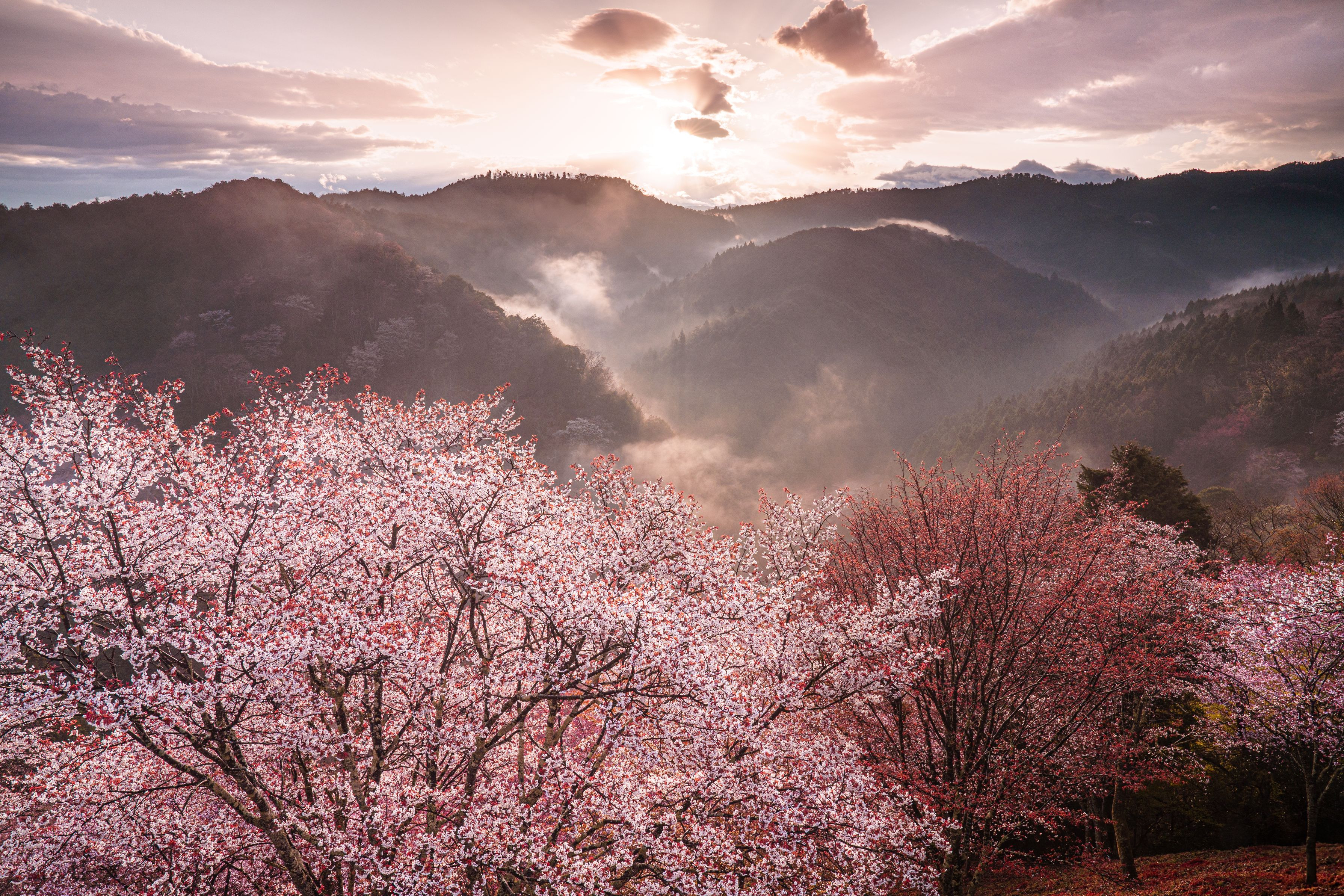 雨上がりの吉野山。途中、雨が降ったりやんだりを繰り返し雲の中から、柔らかな朝日が現れてくれました。