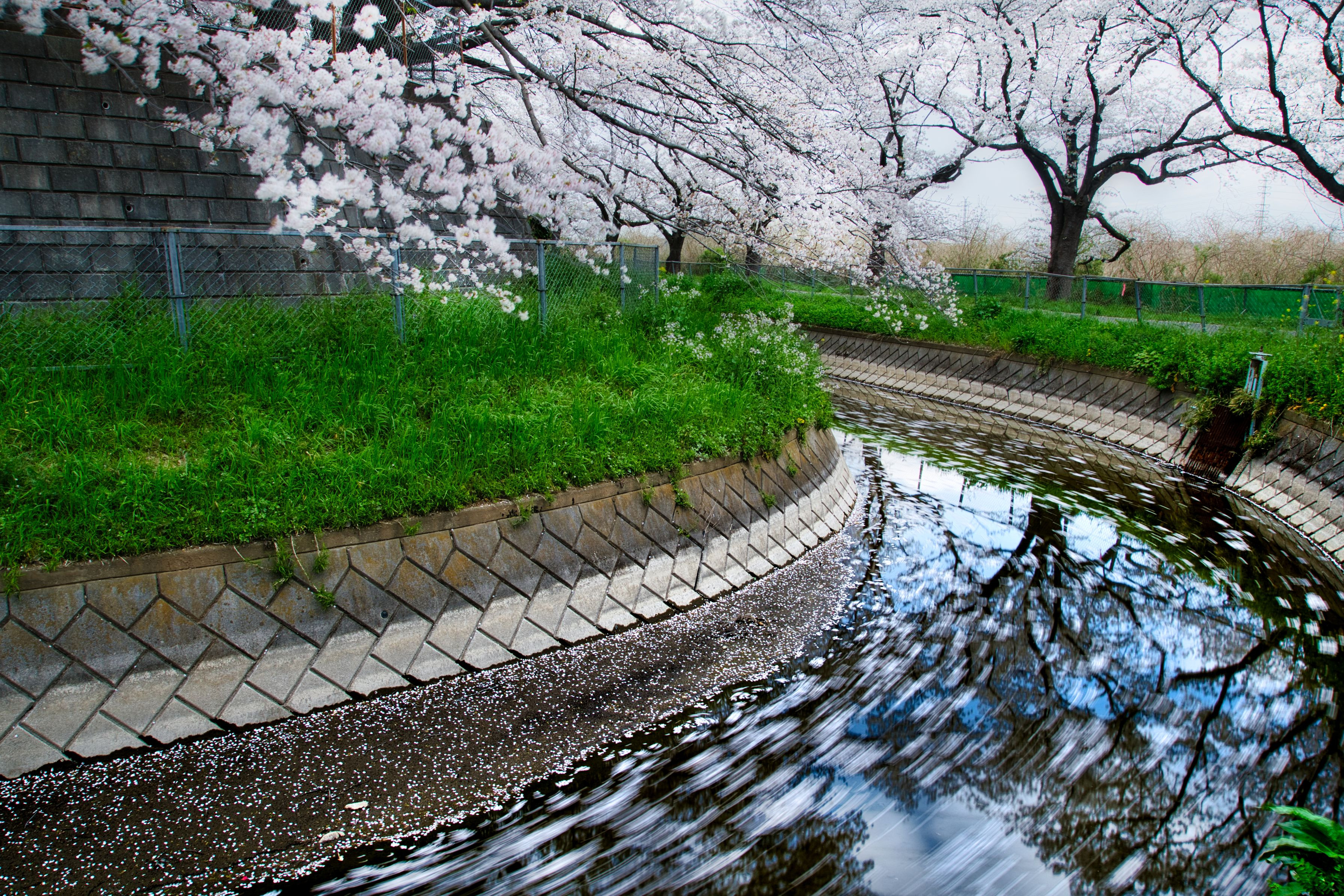水路を流れる花筏の曲線・緩やかな流れ 長時間露光:8秒が織りなす世界