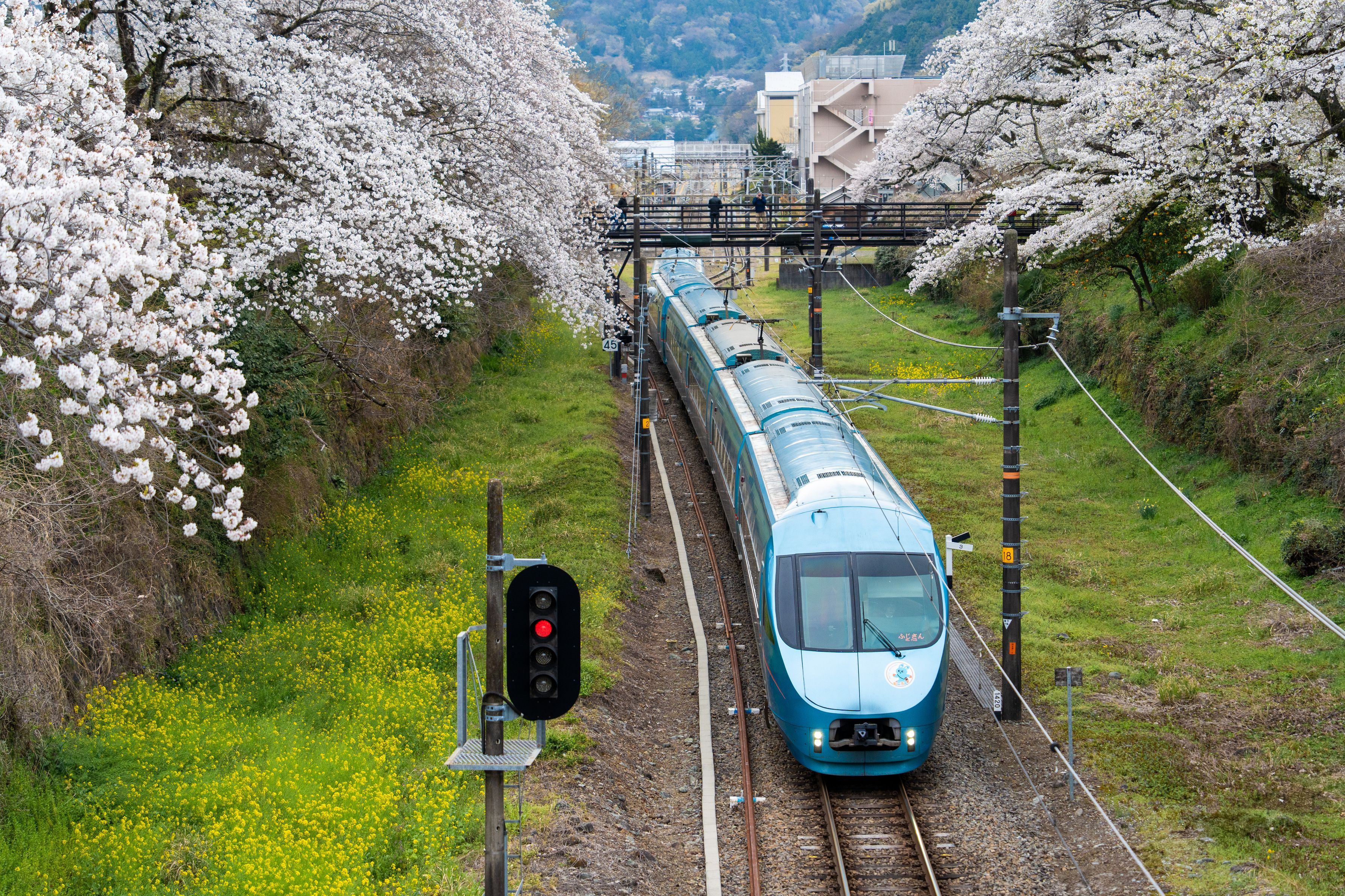 山北駅を通過する小田急ロマンスカーMSE車。 桜と菜の花が満開でした。