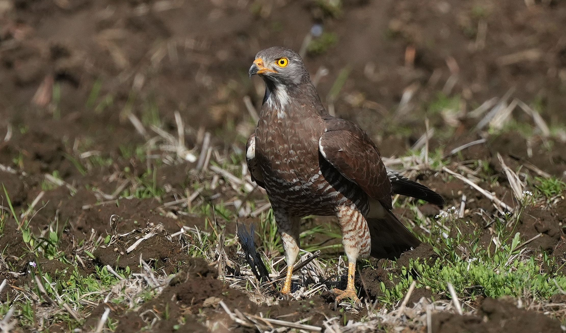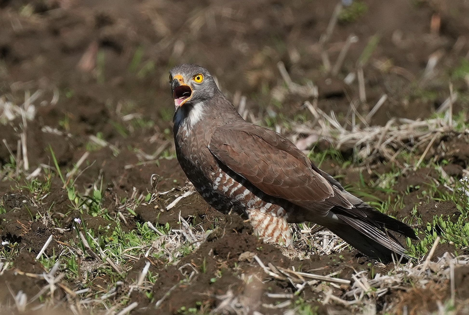 サシバが目の前の水田に求愛給仕の為の餌取りに降りました。