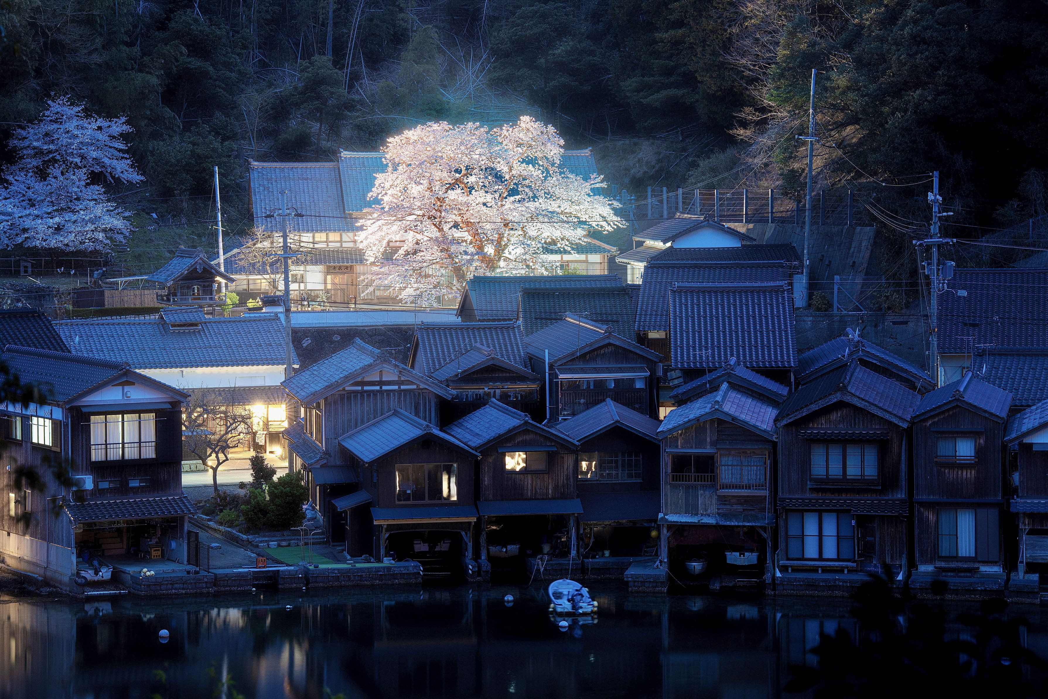 言わずと知れた伊根の舟屋。春のライトアップ。