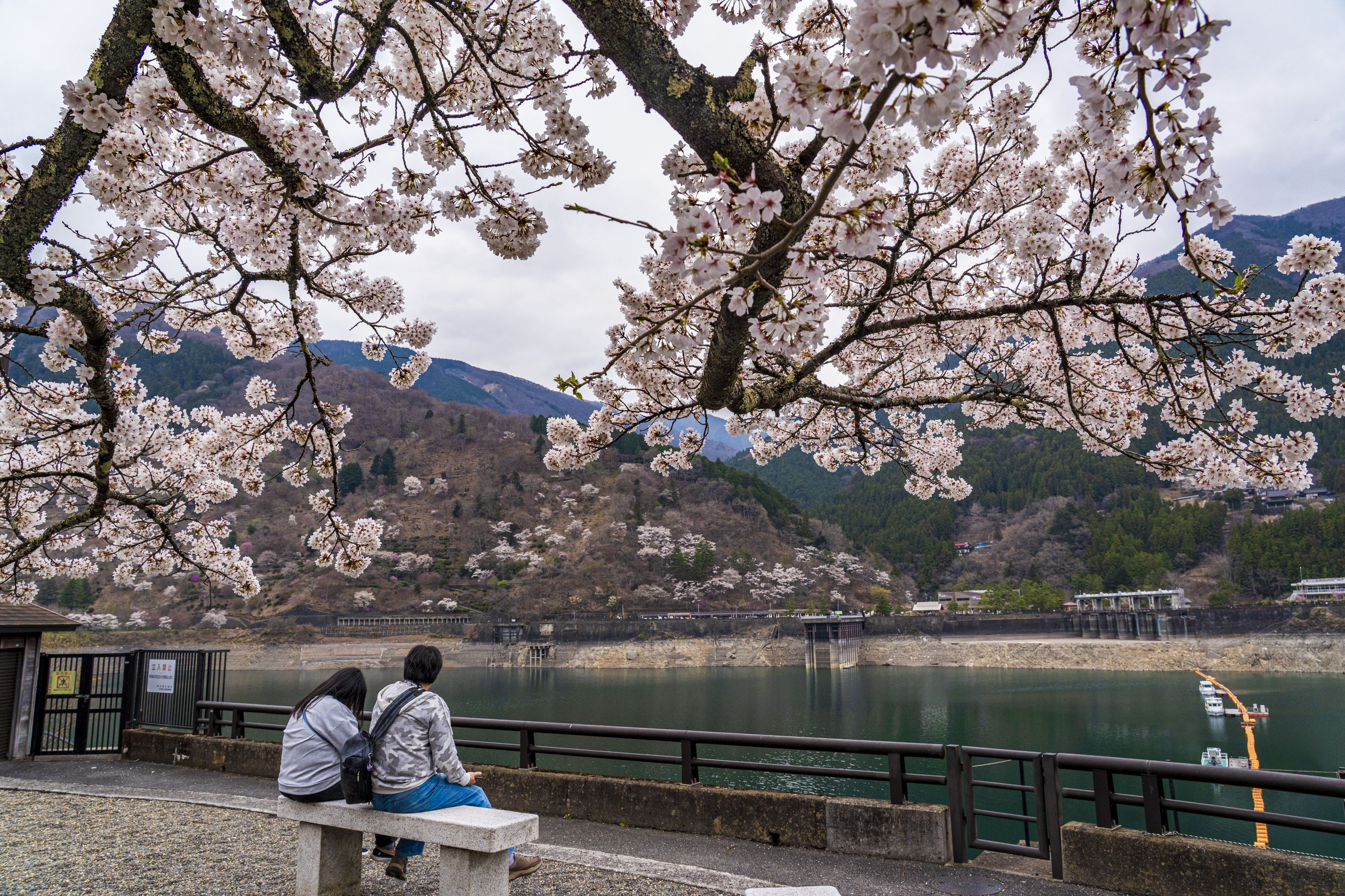 壮大なダムを楽しむ人を後ろからそっと見守るような桜。