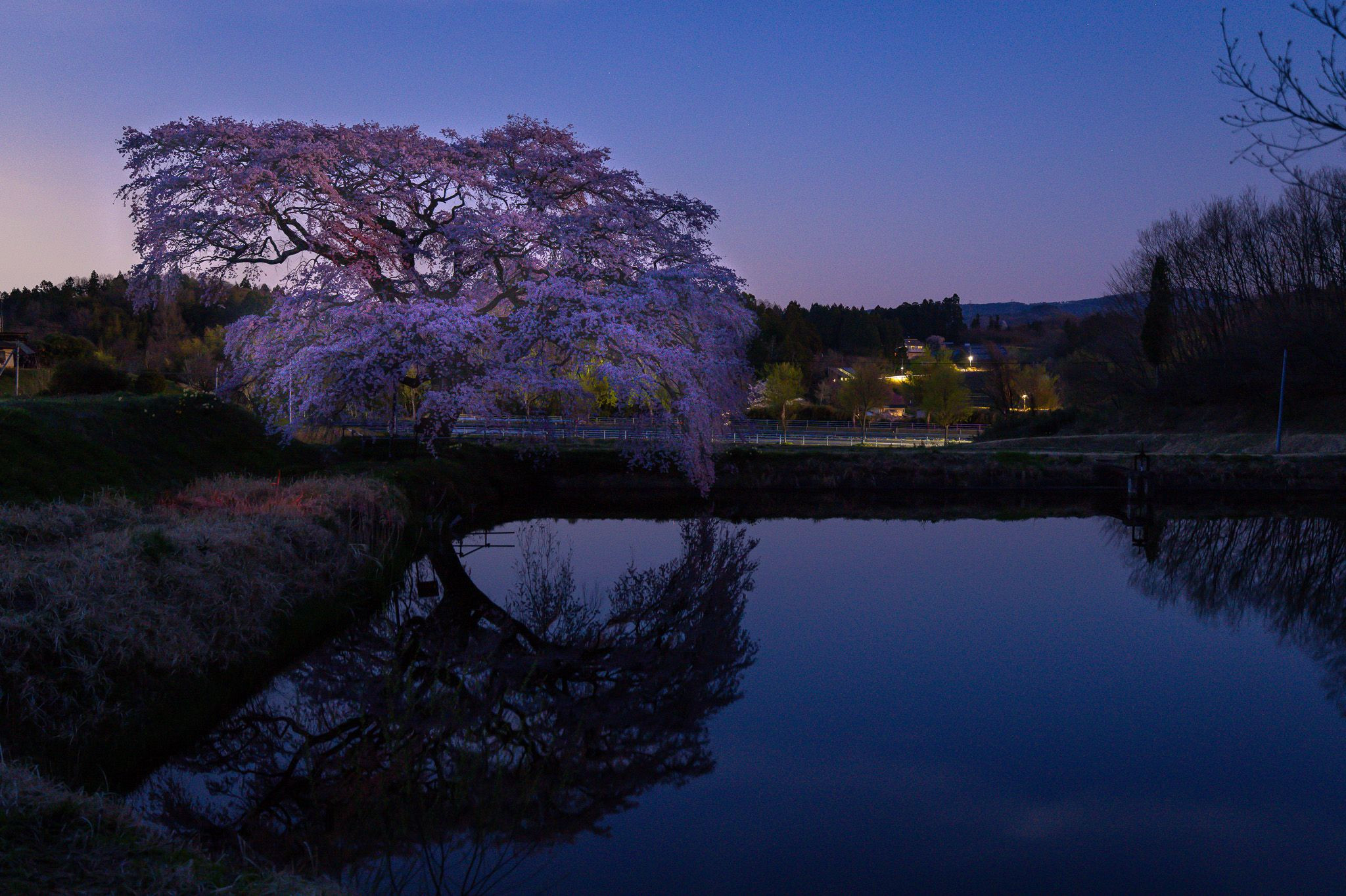 福島県にある芳水の桜。夕方から夜にかけての時間帯。ライトアップはなしでしたが、空と水面のグラデーションの中に佇む桜がきれい。
