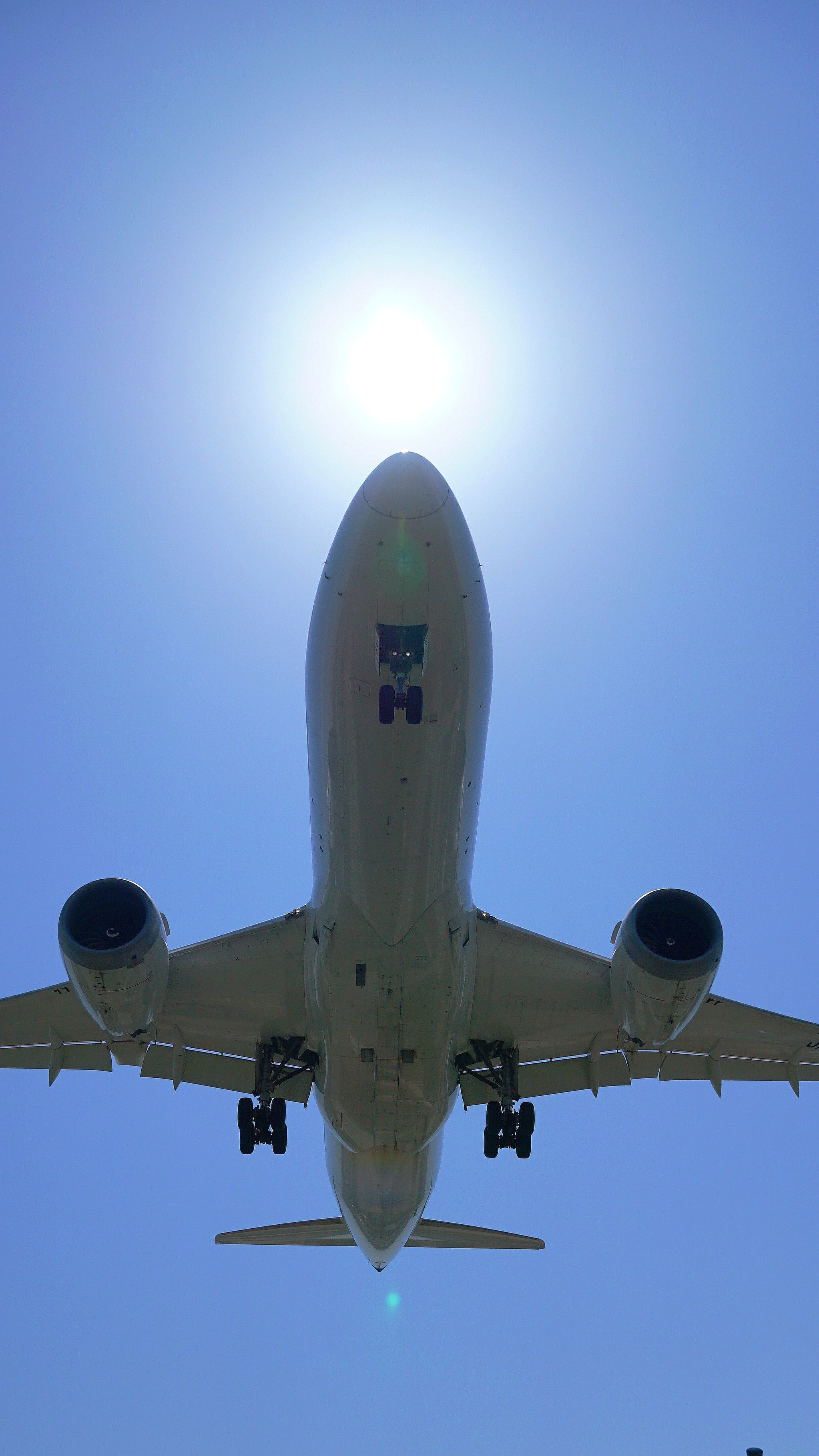 大阪伊丹空港南の千里川土手で撮影。太陽と機首が重なる瞬間を待ちました。