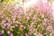 駅の入り口前の花壇をピンク色で覆ったフクロナデシコの花