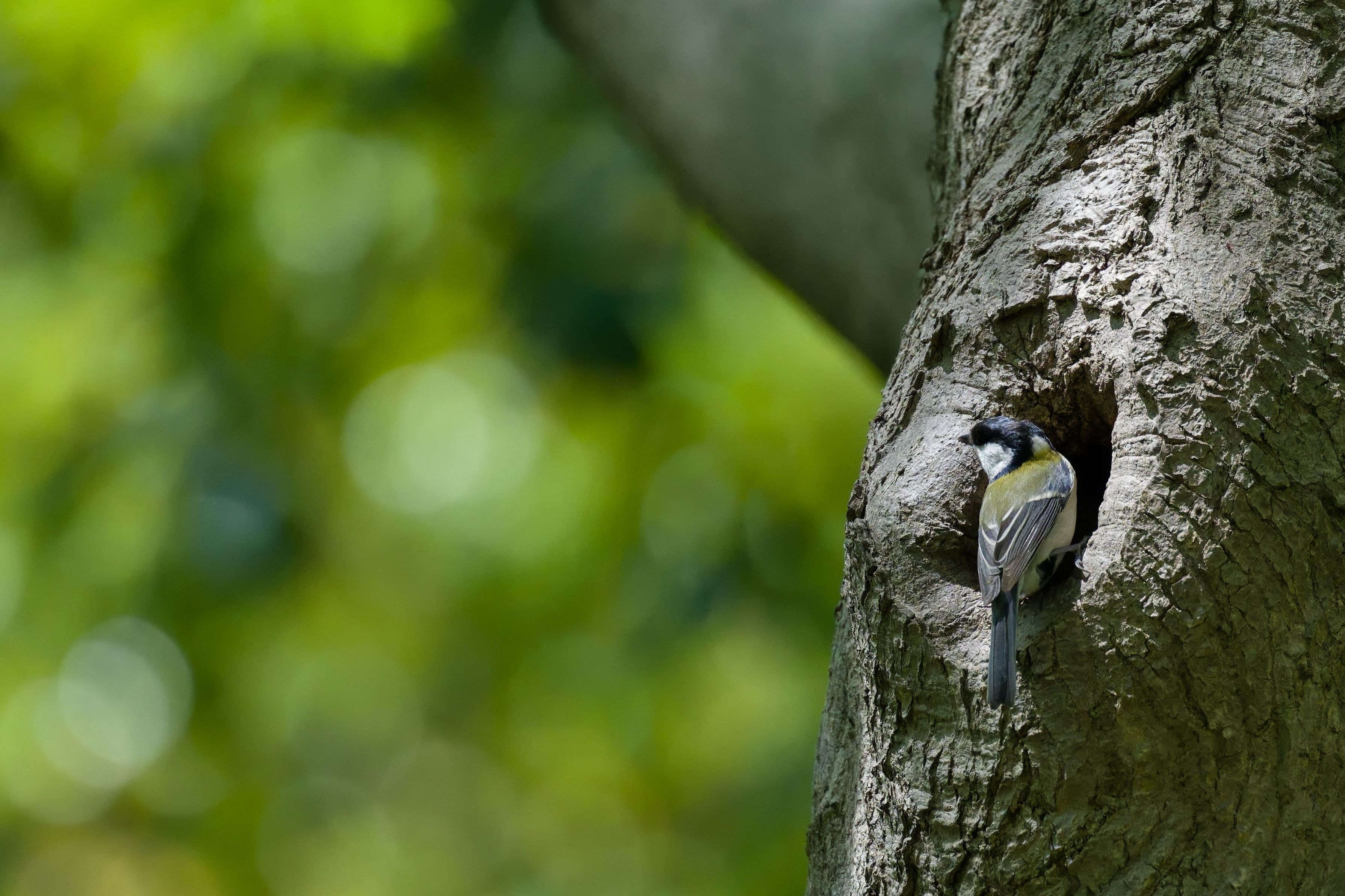 ずーーっと留まってナワバリ主張するシジュウカラがいたので、緑を背景に一枚。穴の奥に潜り込む間も鳴き止まない入れ込み様でした