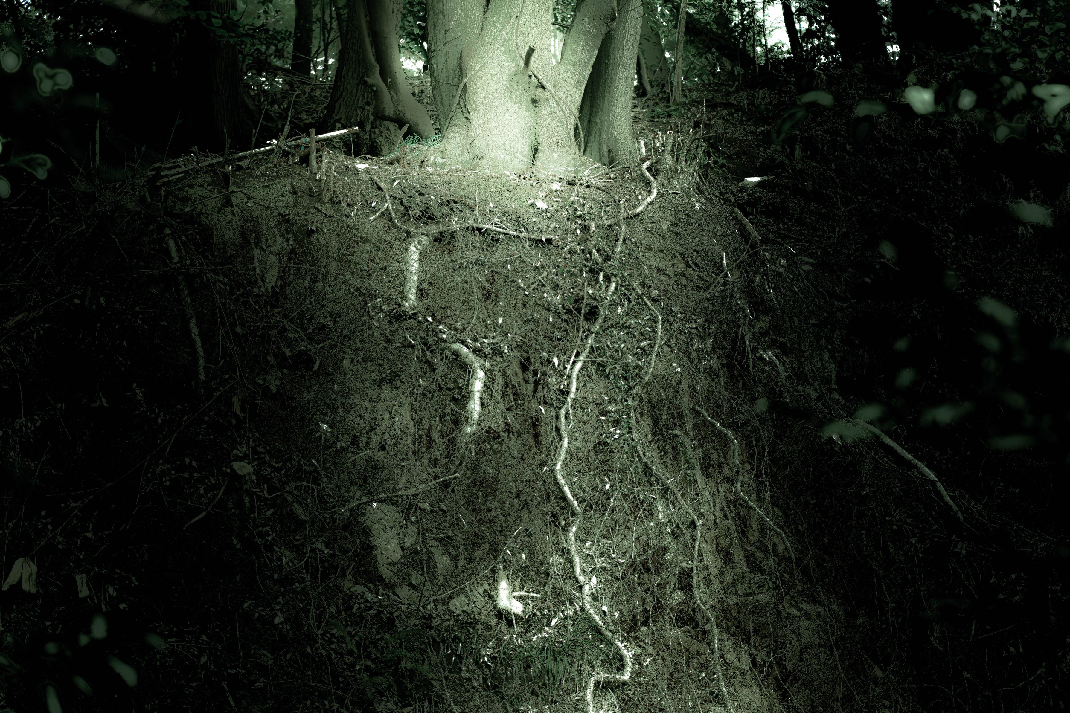 山の中の小さな断崖。木の根がむき出しに這っていた。あまり美しいとは言えない状況だが、生命力を感じた。根を強調するためにマスクによる部分露出調整、及び色彩度の低下処理を行なっています。