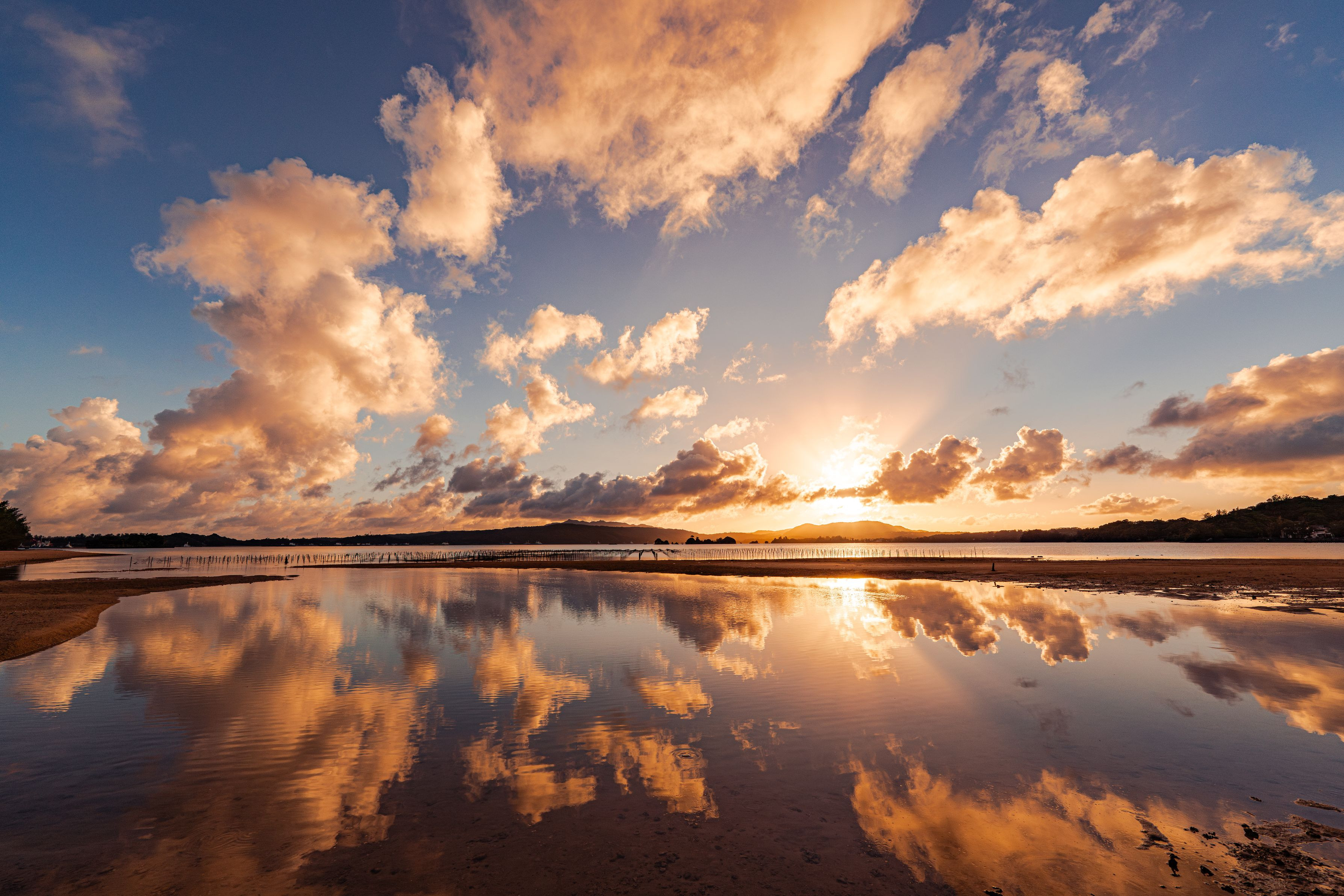雲がいい感じで流れていて海に反射していることで画面いっぱいの夕景が撮れました。