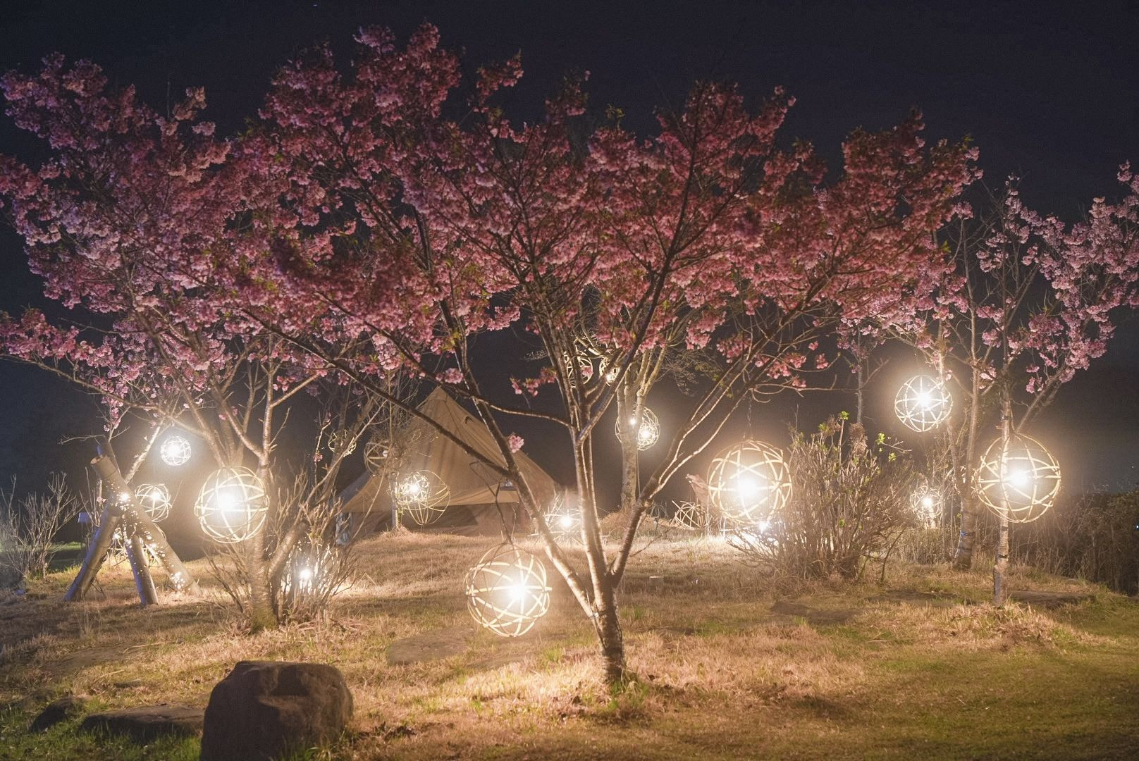 いつもお世話になっているキャンプ場にて (熊本県南小国町 ゴンドーシャロレー) 標高1000mくらいあるので、まだ桜が楽しめますし、竹あかりとのコラボが最高でした。