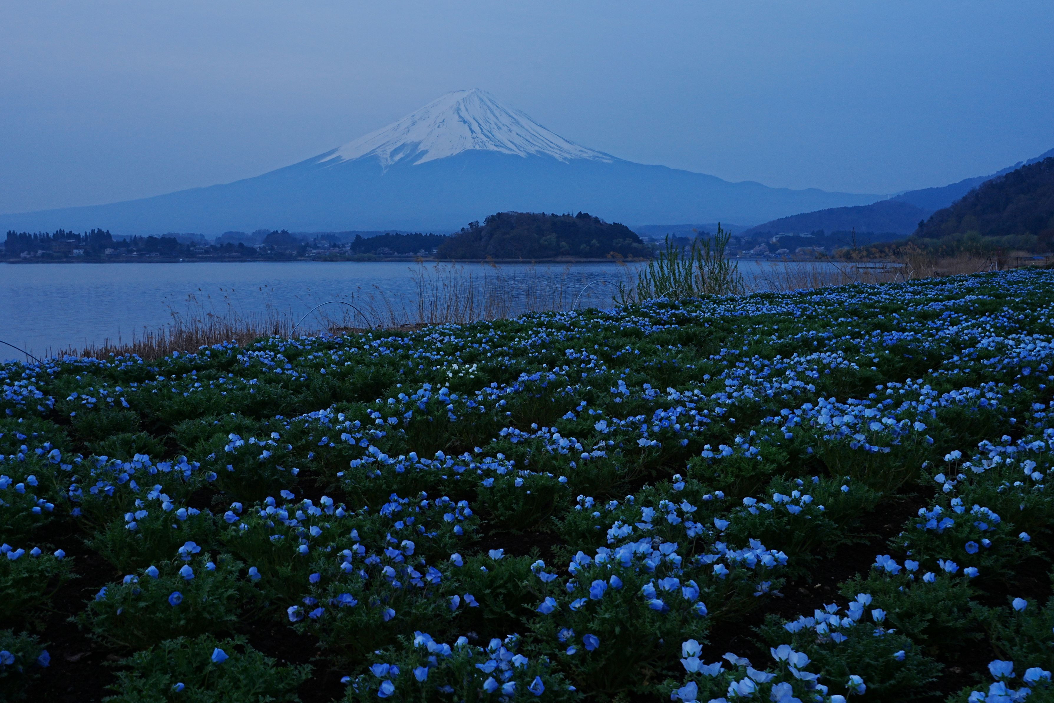 夜明け前 富士山と咲き始めたネモフィラ 2025/4/18河口湖にて撮影