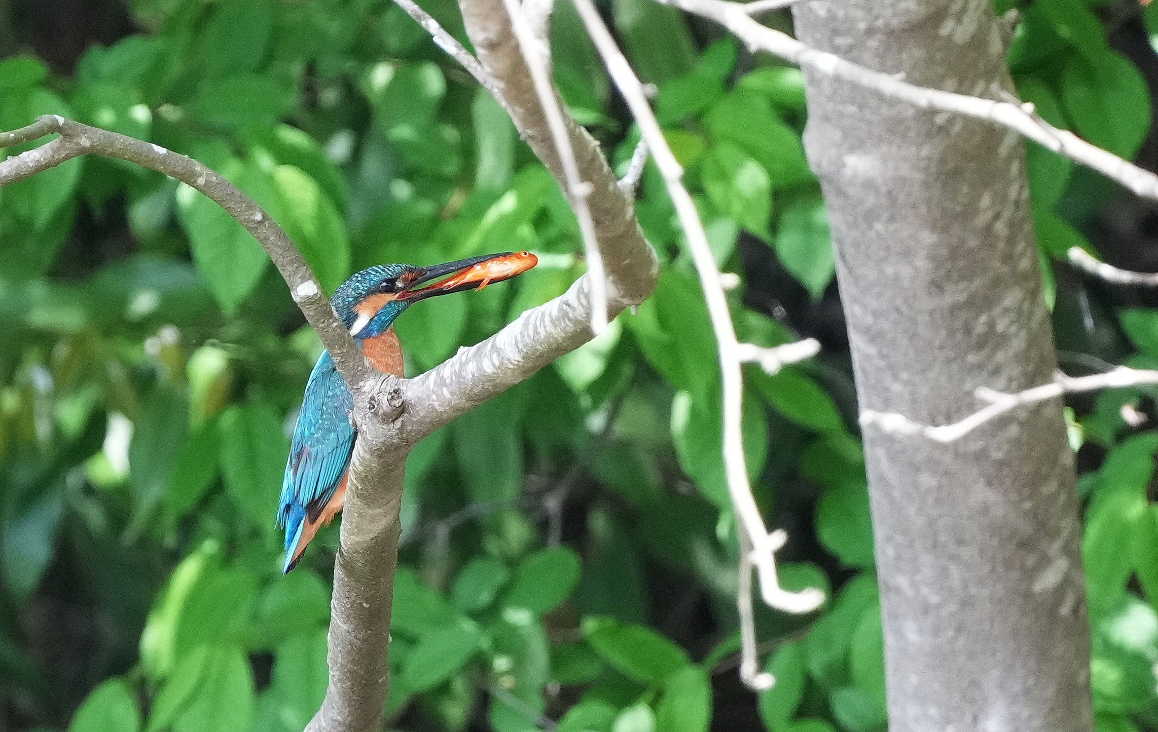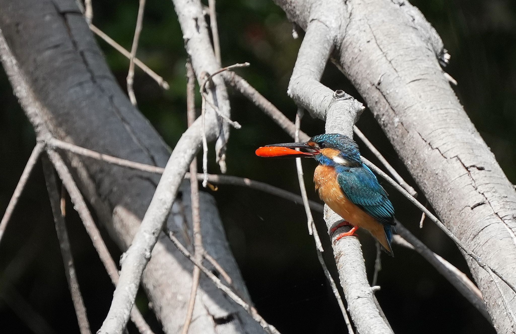 カワセミが緋鯉の幼魚を捕りました。赤い魚を咥えたカワセミは初めてです。咥えてる幼魚の頭が逆なので求愛給仕だと思われます。