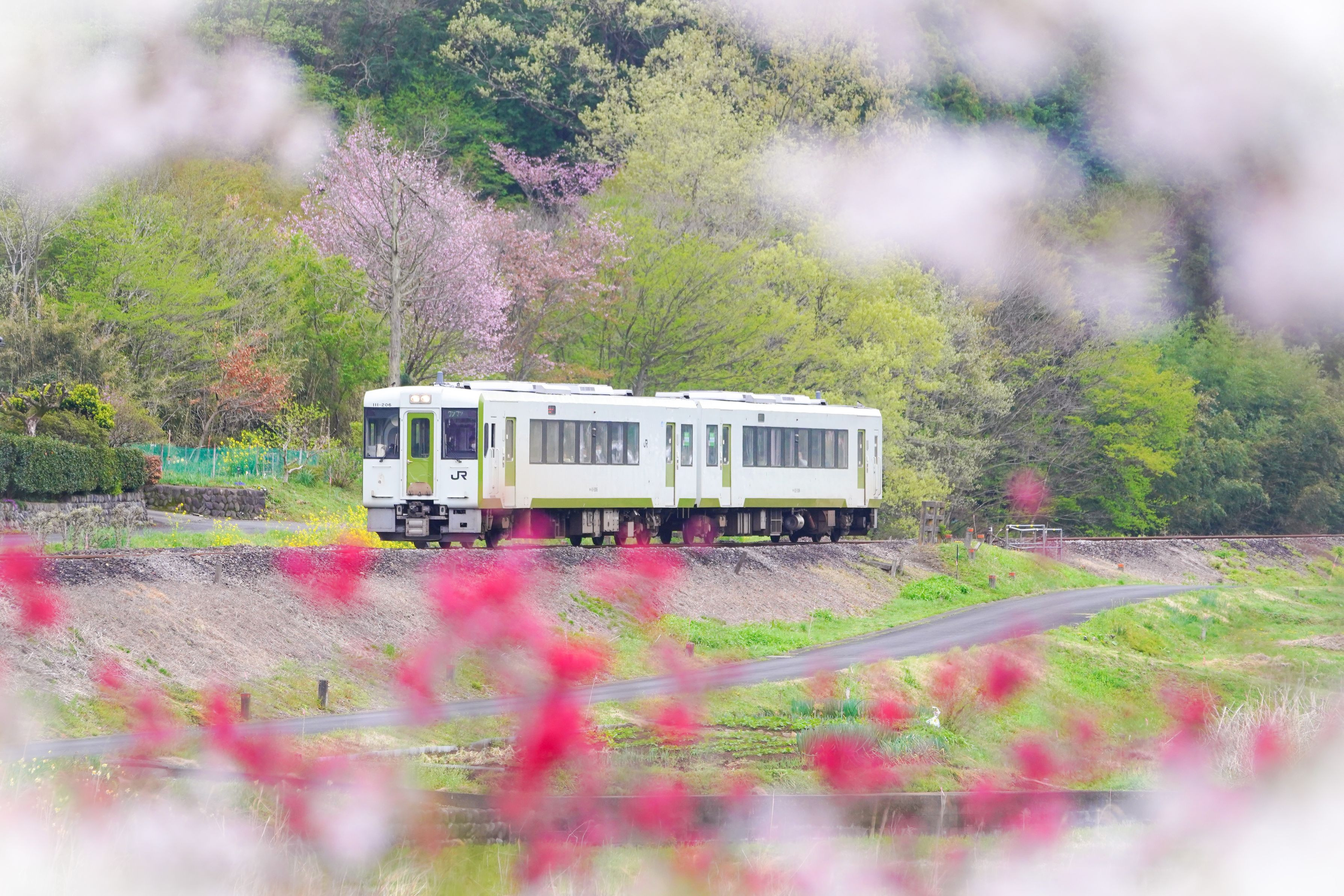 新緑に桜に花桃 菜の花に囲まれてローカル線がトコトコと走る