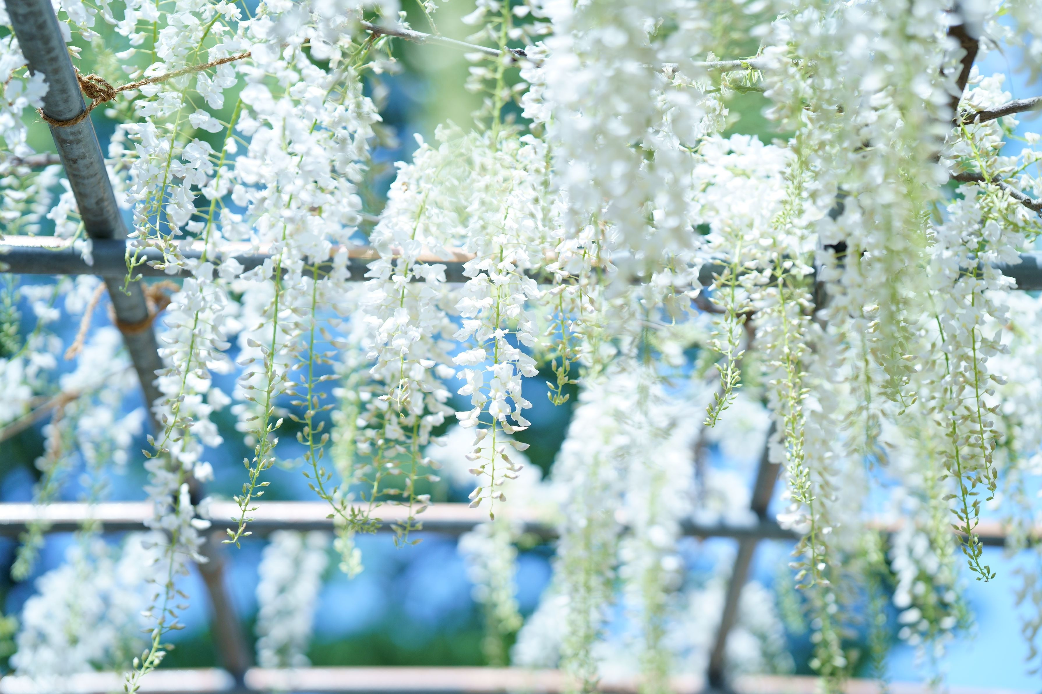 昨年の曼陀羅寺公園にて撮影。 青空に真っ白な藤の花と薄い透き通るような緑色の茎が映えていた。
