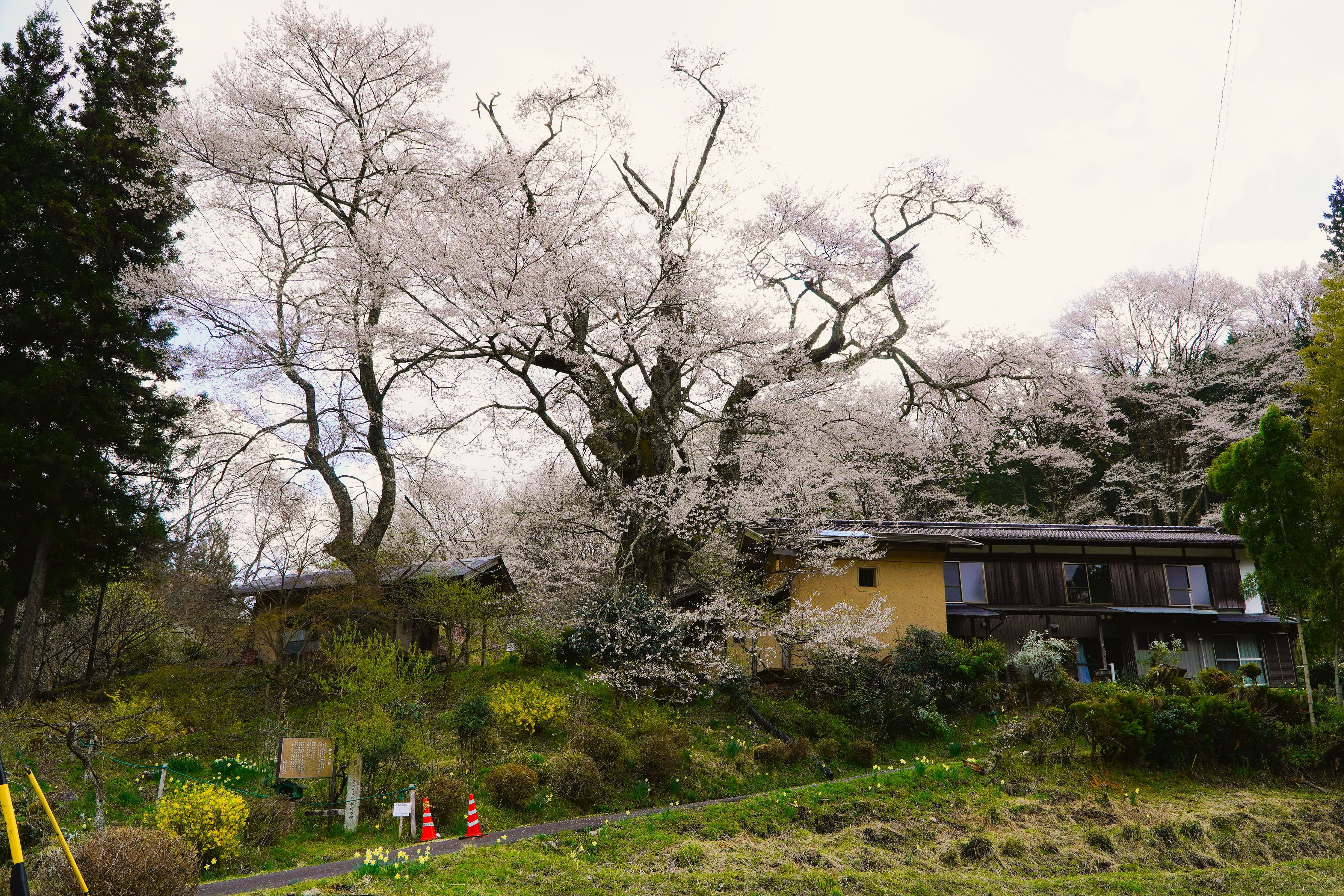 恵那市矢作町本郷地区の個人宅に咲く、1本のコヒガンザクラの古木で、樹高25m、幹囲5.0m、樹齢500年と推定とのことです。周囲にも沢山の桜が植えれれており、素敵な光景が見られます。