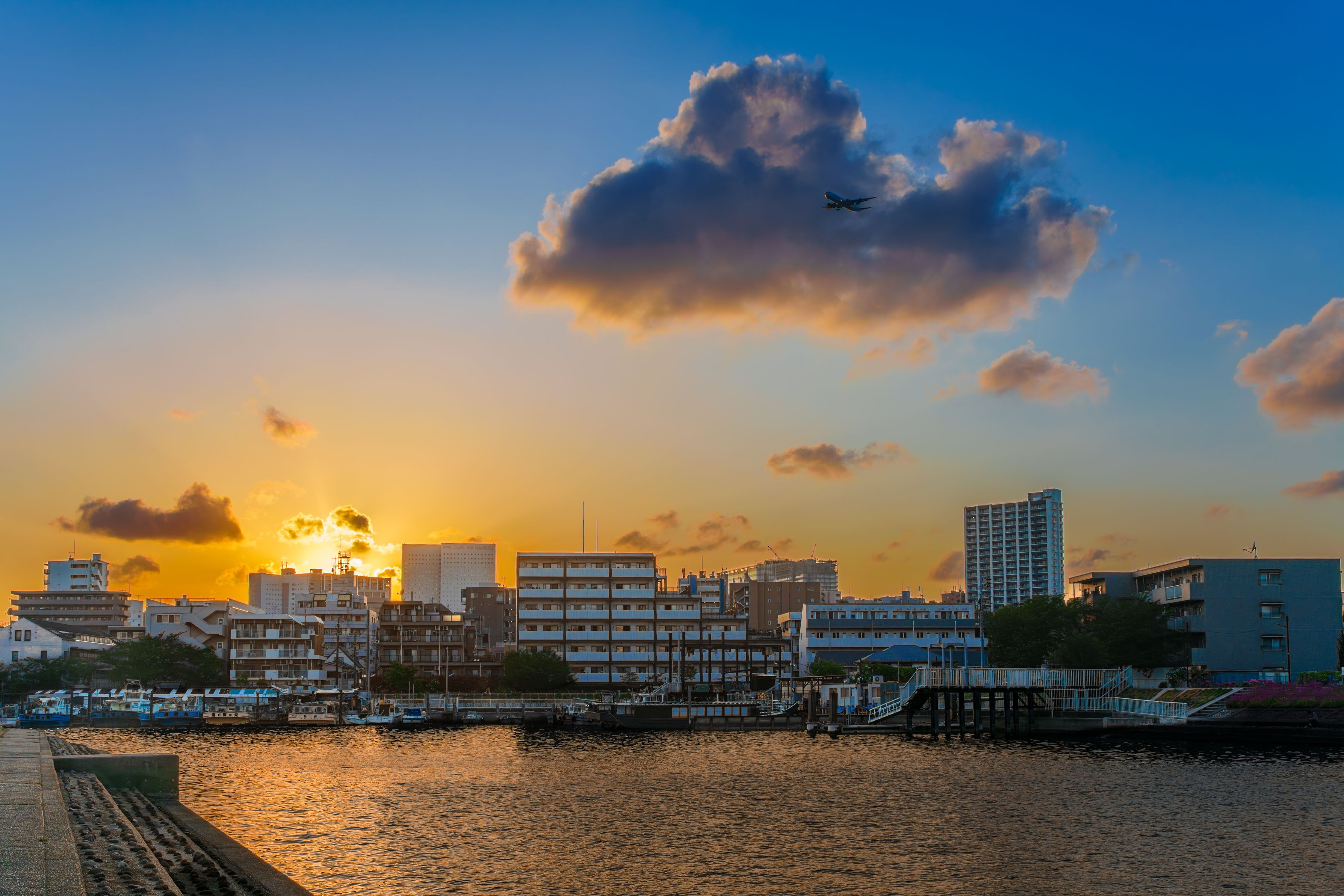 雲をバックに羽田A滑走路に向かう旅客機と共に勝島運河の夕景を撮り描き残す...(^^♪ この時期になると夕日の沈む方向がこのポジションから撮る写真にとって最適な位置になります....。 マイセミオールドフレンドレンズライフを楽しむ...(^^♪ MINOLTA AF ZOOM 28-135mm F4-4.5