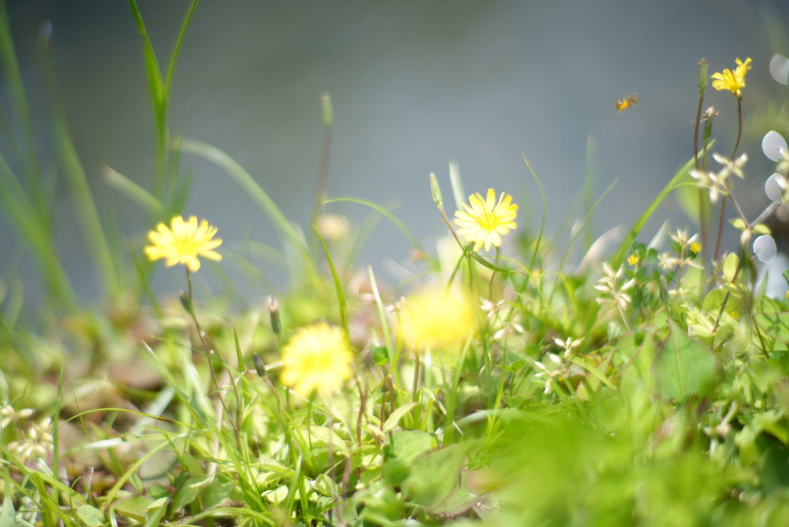小さなミツバチが花から飛び立ったところです。飛行スピードはなかなか速いようです。 80mm F1.4 でマニュアル撮影しました。 ミツバチがどこにいるか探してください。