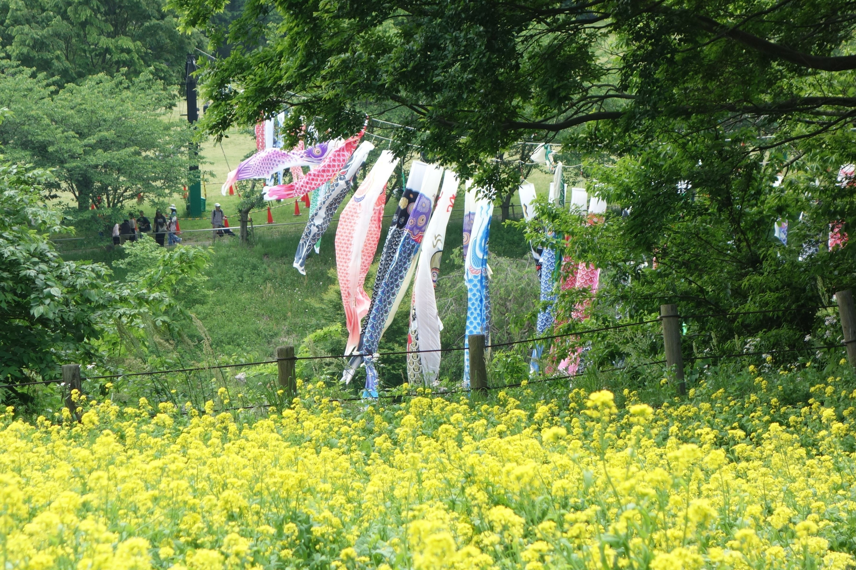 里山の春。菜の花畑越しに鯉のぼりを望む。