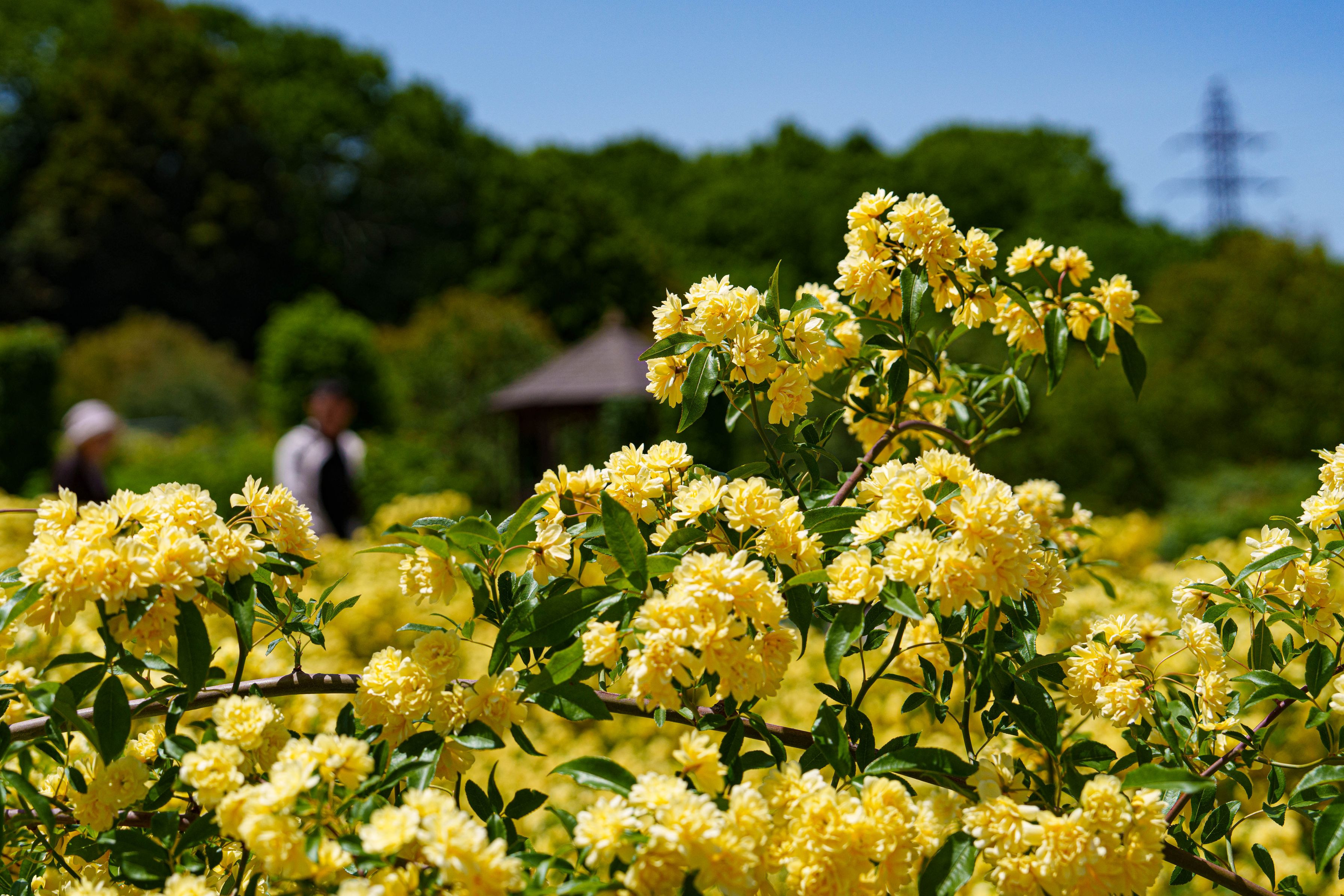 岐阜ローズガーデンにて。自宅の薔薇が咲き始め、7日から開催されるローズフェスタも猛然なのでけっこう咲いているであろうと思って出かけましたが、開いている薔薇はほぼ皆無。唯一、迎えてくれたのが満開のこの「キモッコウバラ」でした。春の温かな日差しの中、満開の花々の美しさは息をのむほどでした。