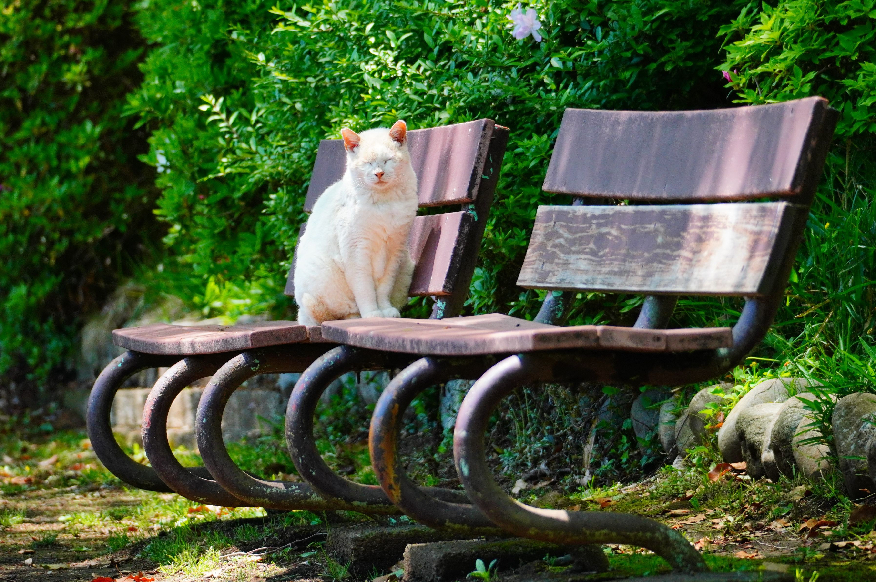 公園猫のシロ。 この辺りが彼のテリトリーで、このベンチはお気に入りの様です。