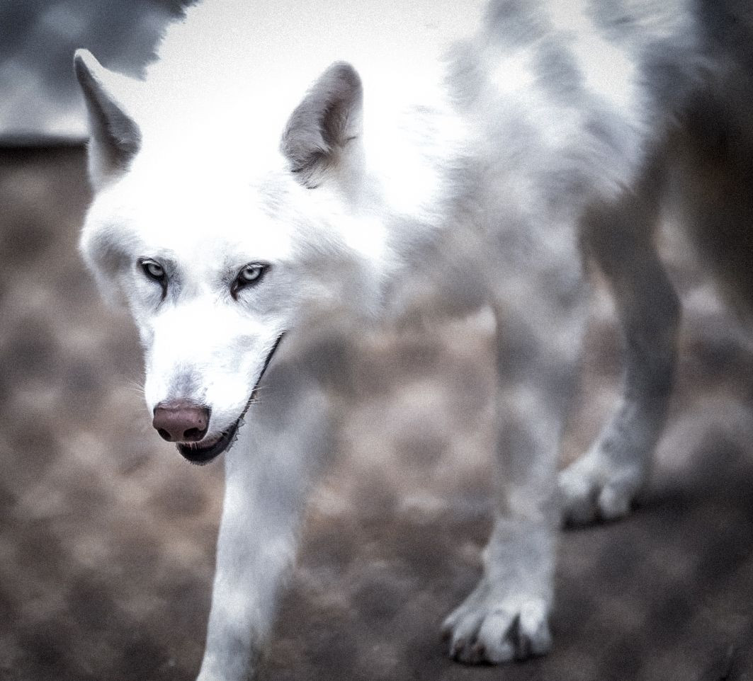東山動物園のホワイトウルフです。 ホラー色強めに加工しちゃいました。 黒っぽい模様は檻です。