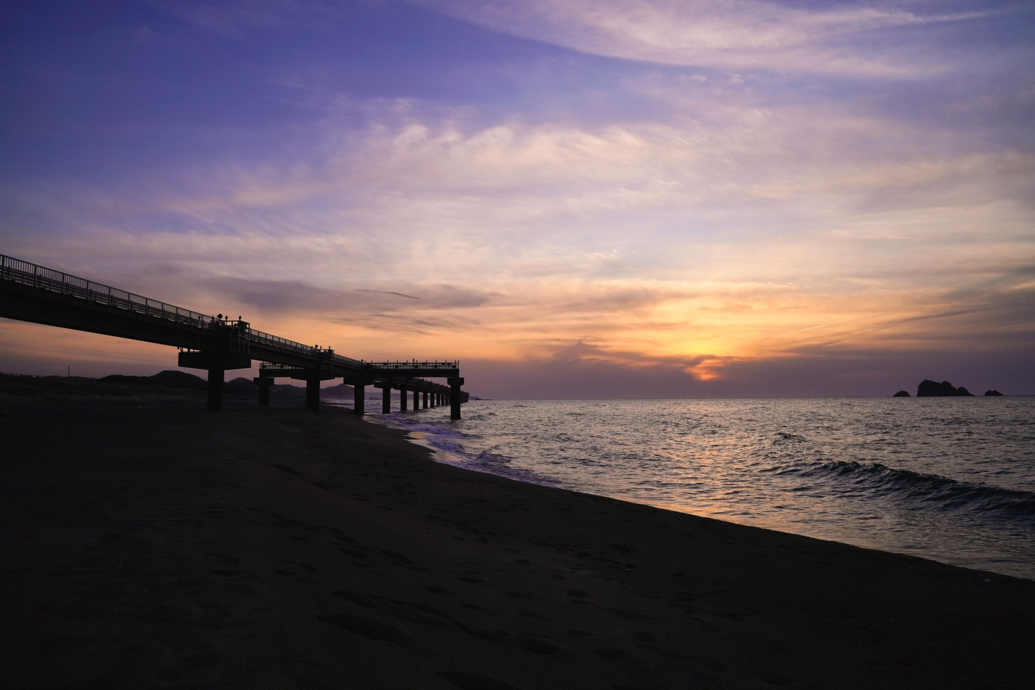 鳥取市の伏野海岸 空港の進入灯と日本海の夕暮れを撮影。 離陸する飛行機を撮影したかったですが、風向きで反対側に離陸しました。 田舎の空港なので、次便まで待てないので、 また今度ということで、1キロ程度砂浜を歩いて帰りました。