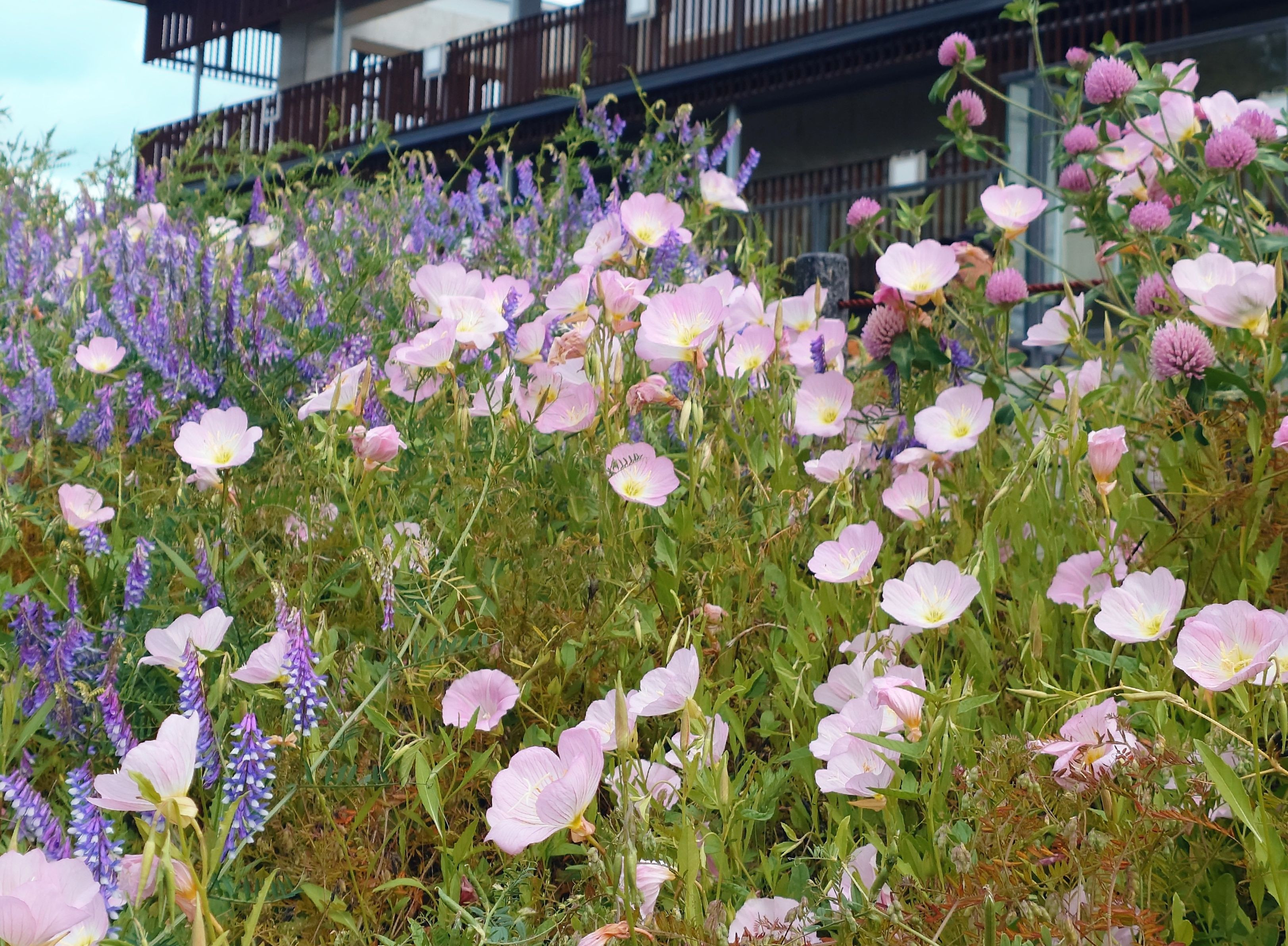 消防署そばの公園に咲くナヨクサフジとツキミソウとムラサキツメクサのコラボで咲いてました。 それぞれが満開です。
